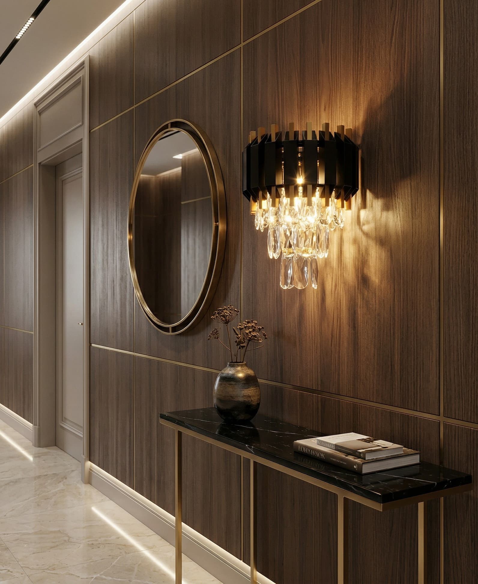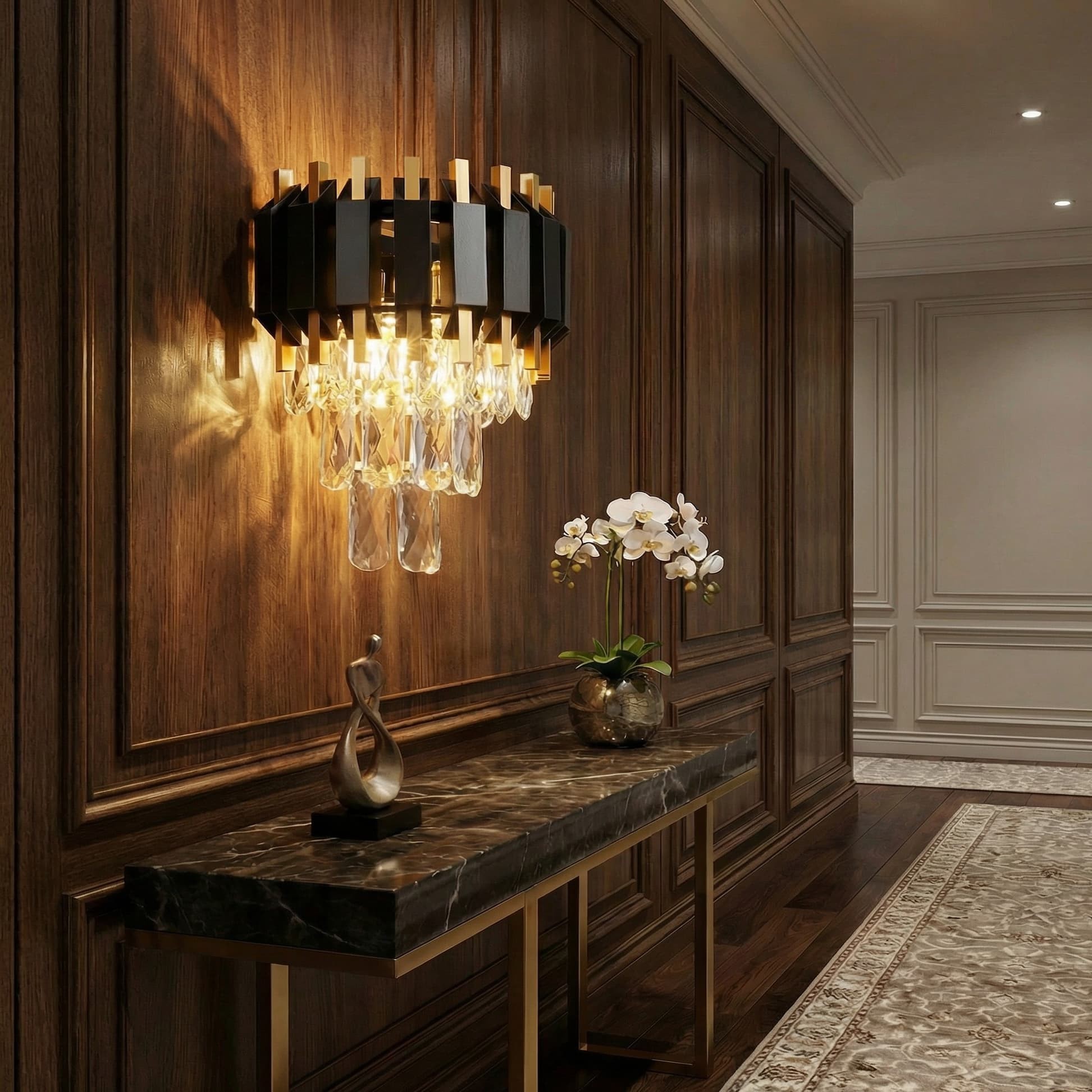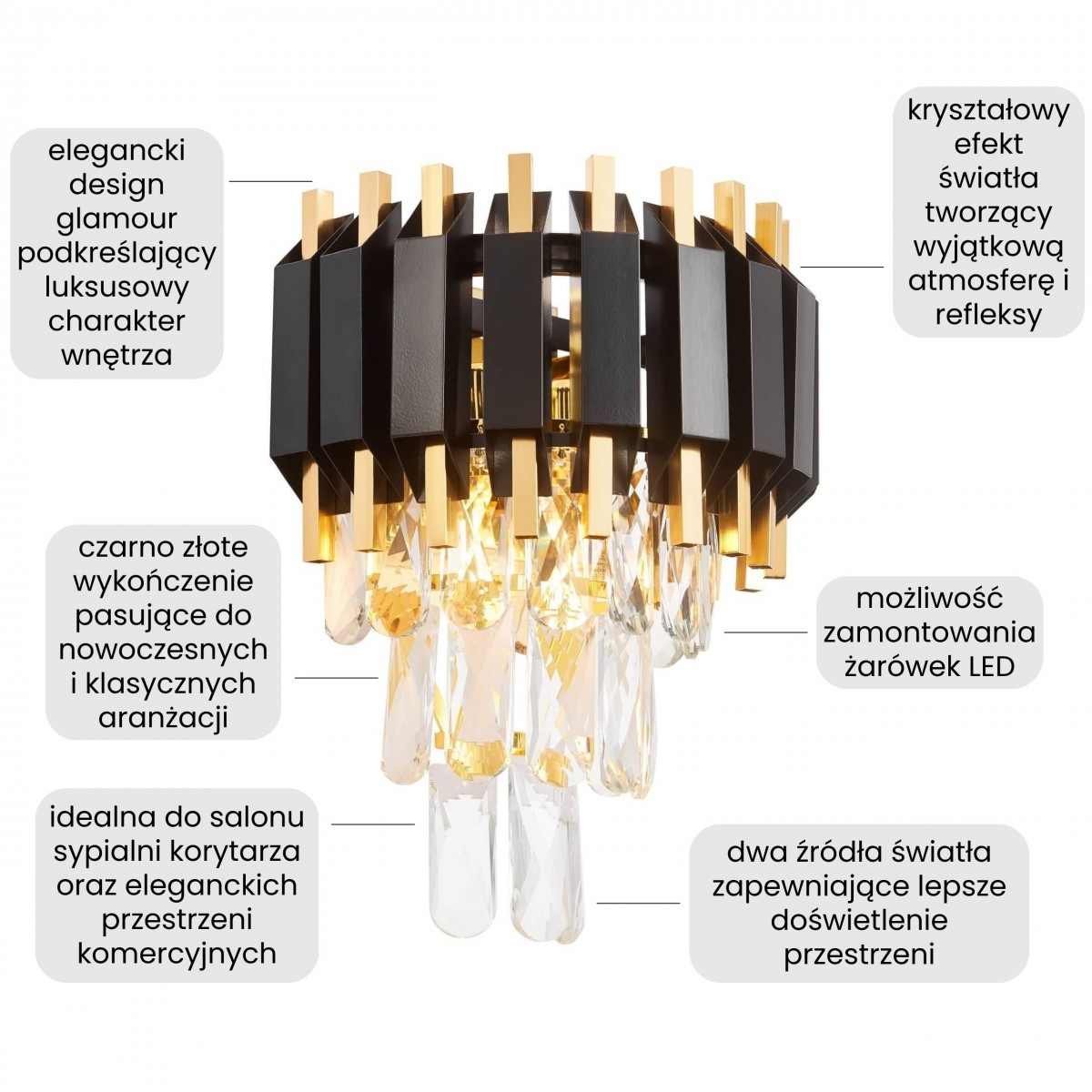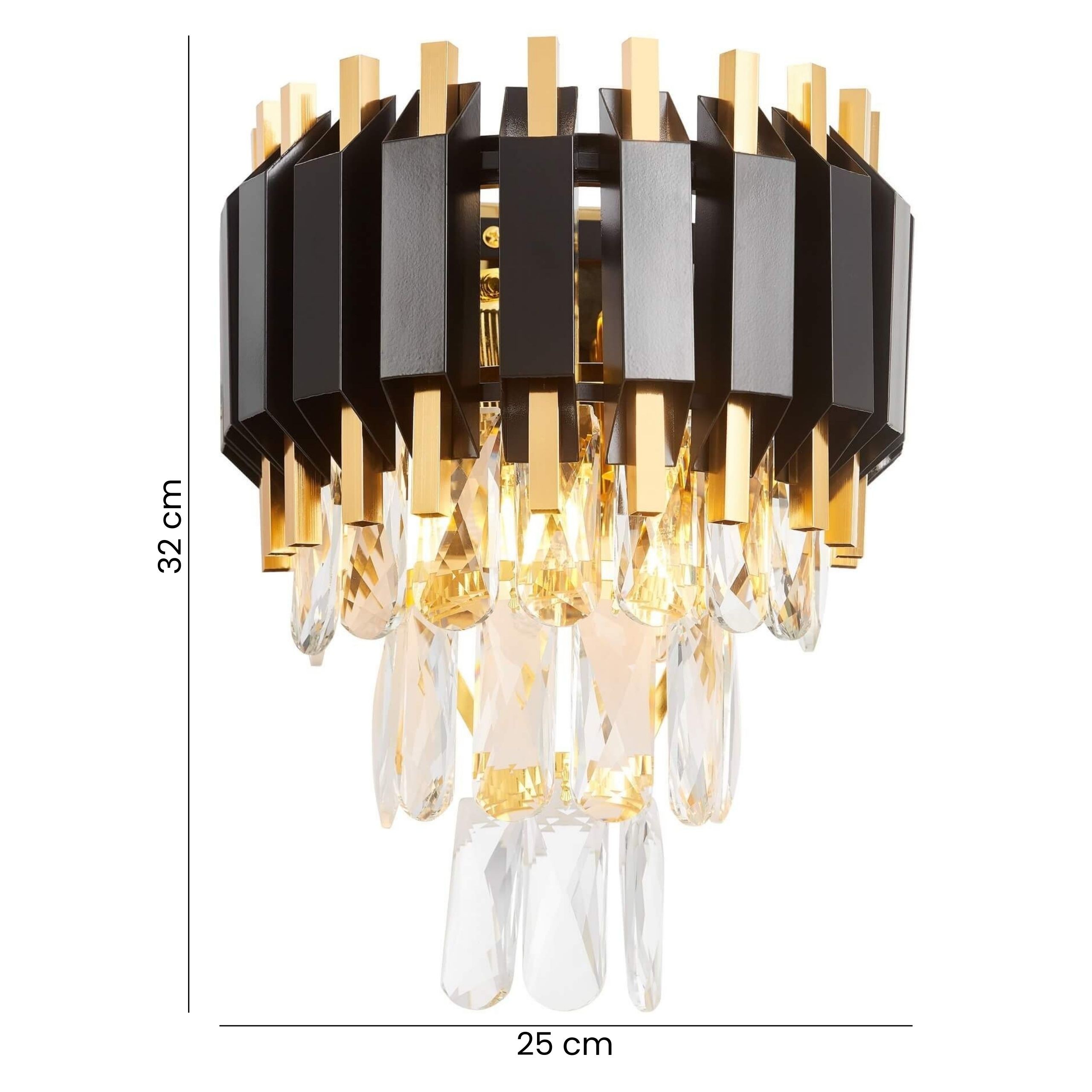 RIVO W2 to kinkiet w stylu glamour stworzony dla osób, które szukają oświetlenia z charakterem, ale w nowoczesnym wydaniu. Połączyliśmy czarne, pionowe segmenty ze złotym wnętrzem i kaskadą kryształów, aby stworzyć efekt premium, który przyciąga wzrok już od progu. Dzięki wysokości 32 cm lampa jest widocznym akcentem na ścianie, który podkreśla styl salonu, sypialni czy reprezentacyjnego przedpokoju.