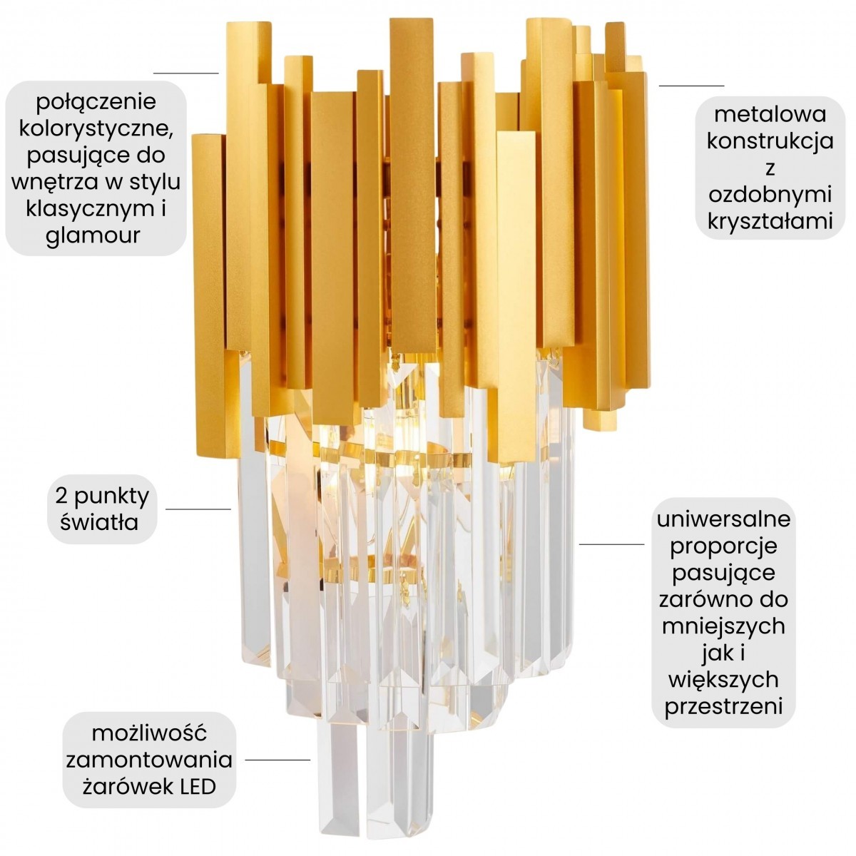 FERA W2 to złoty kinkiet, który zachwyca grą złotych, pionowych elementów i szlifowanych kryształów, które układają się w kształt przypominający elegancką kaskadę. To oprawa, która od pierwszego spojrzenia wprowadza do wnętrza poczucie wyjątkowości.