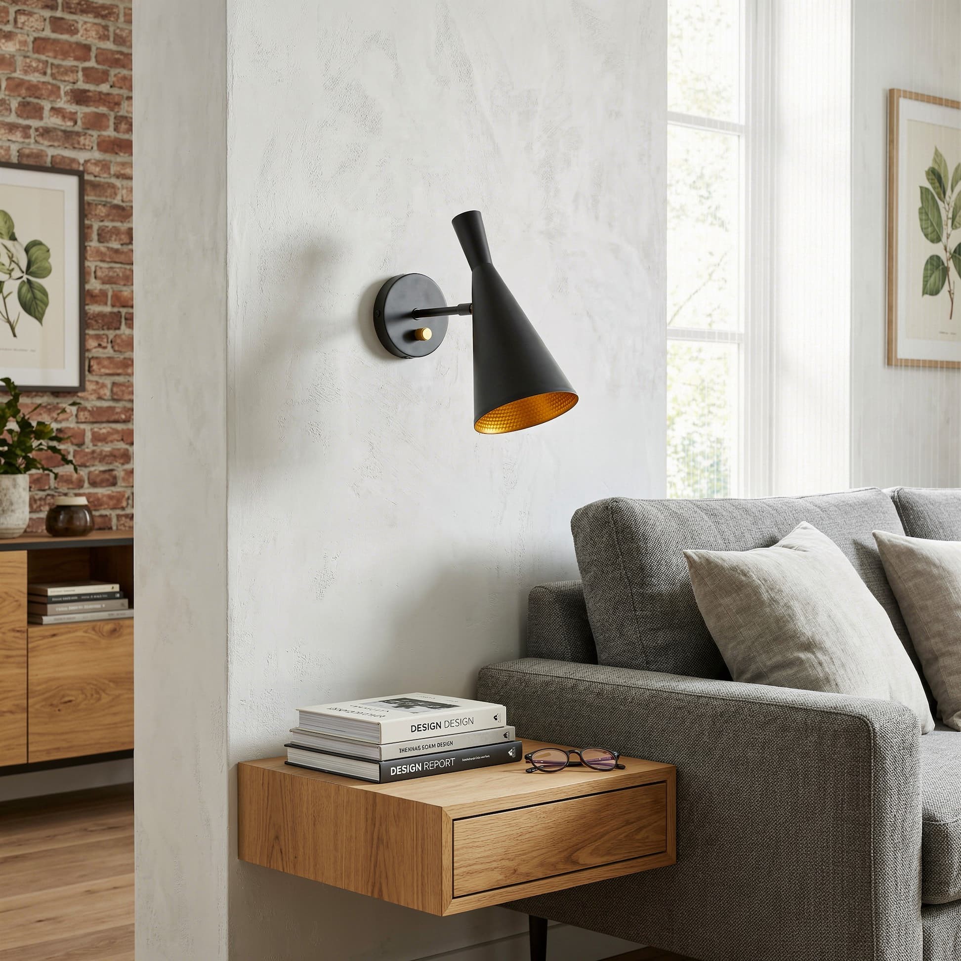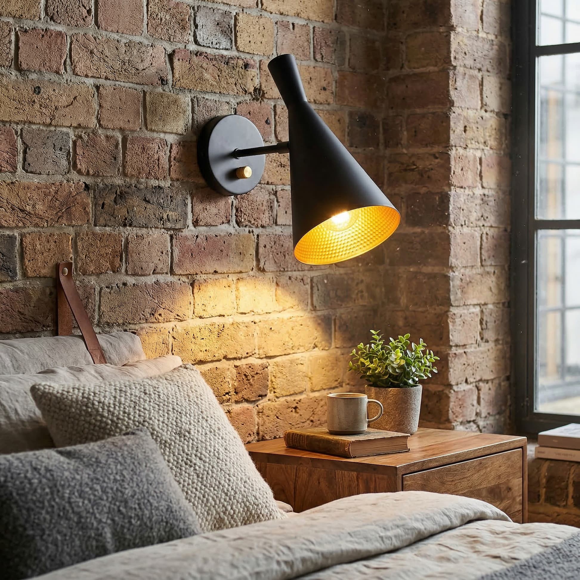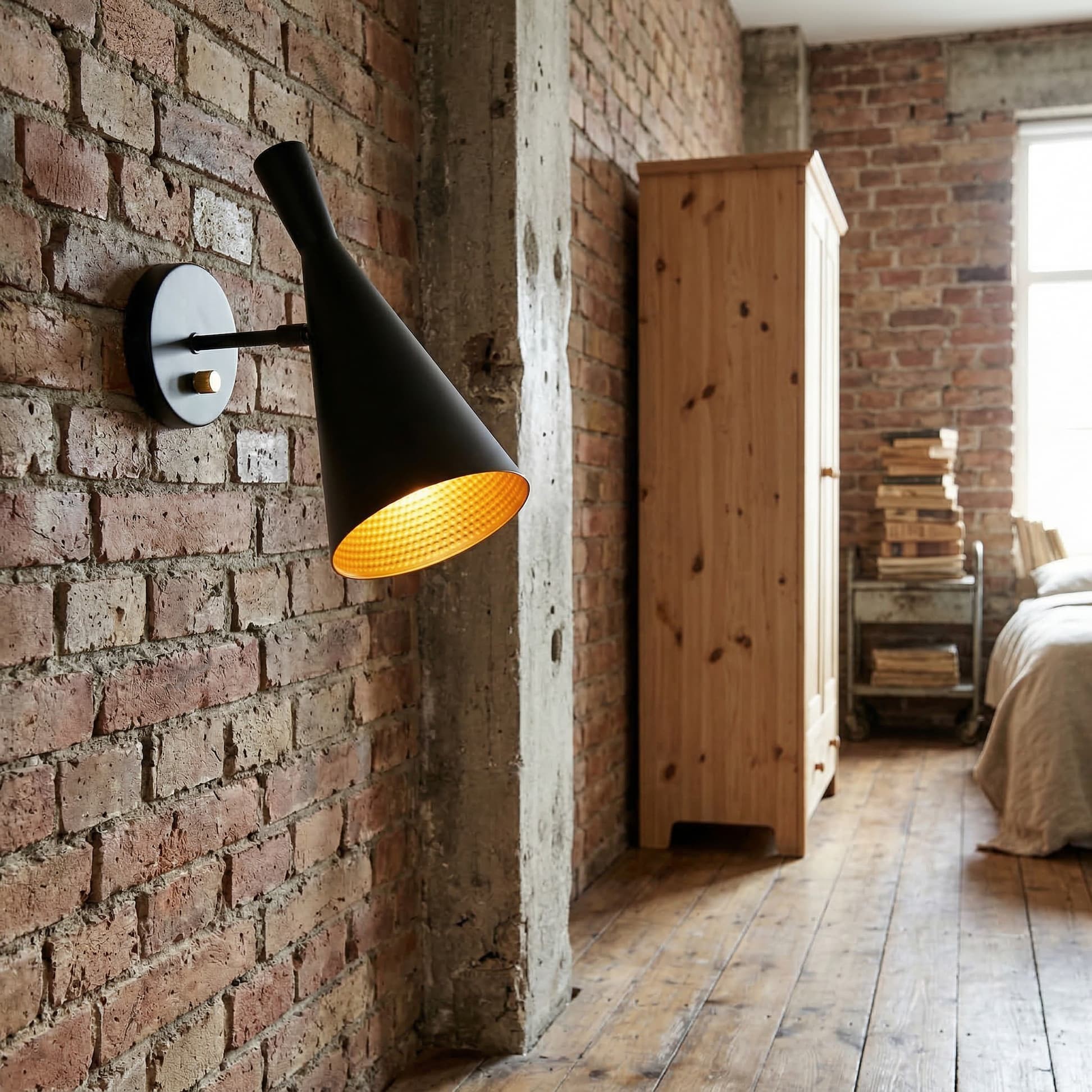 Lampa ścienna FOGGI, jako przedstawicielka stylu loftowego w oświetleniu, doskonale prezentuje jego cechy szczególne, a dodatkowo prezentuje się wyjątkowo stylowo i szykownie. Czarna oprawa kinkietu wraz z jego złotym wnętrzem tworzy designerski element funkcjonalno-dekoracyjny do salonu, biura czy pokoju młodzieżowego.