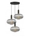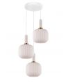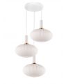 Seria FLORI doskonale wpisuje się w klimat współczesnych przestrzeni, dzięki swojej subtelnej aranżacji oraz niebanalnemu połączeniu kolorystycznemu, który jest w stanie wkomponować się w przestrzeń mniej lub bardziej ekstrawagancką. Swoją harmonią obdarzy każdy zakątek domu – minimalistyczne wnętrza ozdobi delikatnością, a te bardziej wyszukane poskromi i nada im elegancji. Trzy białe klosze nadające całości lekkości i wykwintności zostały wykonane ze szkła i uformowane na kształt spłaszczonych kul o ciekawej, żłobionej powłoce. Dół kloszy pozostaje otwarty, co ułatwia wymianę żarówki oraz dbanie o czystość produktu. Natomiast górna część udekorowana została prostym, choć specyficznym uchwytem w formie białej tuby, ozdobionej złotą obręczą. Lampę wiszącą wieńczy sporej wielkości okrągła podsufitka, do której przyłączono wszystkie trzy elastyczne kable kloszy.