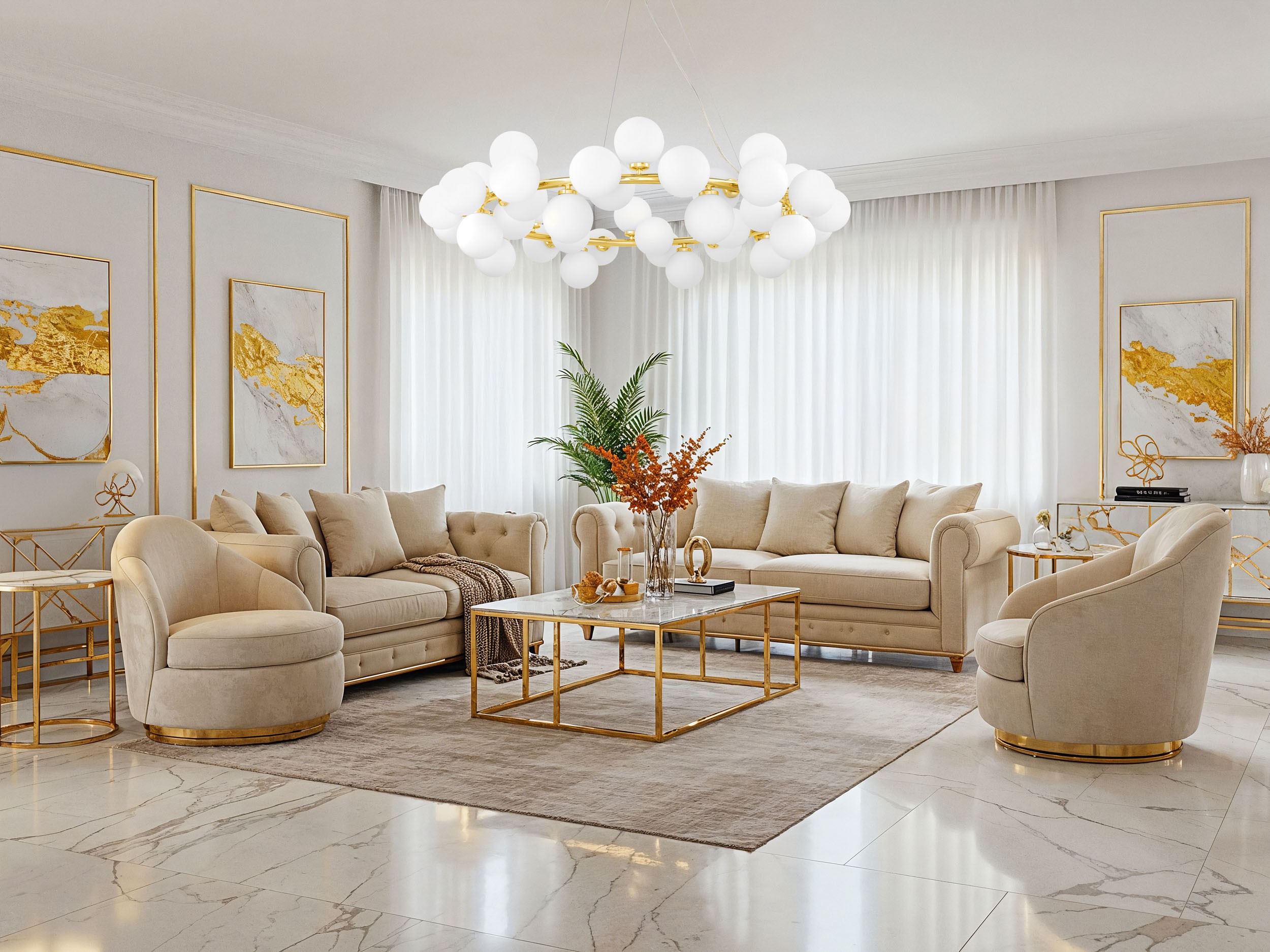 Kolekcja MARSIADA to zestawienie produktów oświetleniowych o ekstrawaganckim wyglądzie, łączących w sobie wyjątkową funkcjonalność, wynikającą z zastosowania w projekcie sporej ilości źródeł światła rozłożonych równomiernie na całej wielkości lampy, oraz efektowność, łączącą się zarówno z liczbą światła, jak i ekskluzywnym połączeniem poszczególnych detali. Większą część lampy pokrywają szklane kule, skrywające w sobie źródła światła, jednak uwagę zwraca również metalowa, złota obręcz, do której zostały one zamontowane. Ich połączenie z obręczą następuje za pomocą niewielkich, filigranowych ramion, zakończonych okrągłą podstawą pod oprawę. Metalowo-szklana konstrukcja zamocowana została do złotej podsufitki o kształcie dysku za pomocą trzech cienkich linek rozmieszczonych równomiernie na stelażu lampy oraz przezroczystego kabla. Dodatkową ergonomią jest tutaj zakres jego regulacji, pozwalający dostosować lampę do warunków i wystroju konkretnego wnętrza. Kolekcja lamp Marsiada występuje w wielu kolorystykach, w tym w eleganckim złocie, stonowanym mosiądzu, uniwersalnej czerni, nowoczesnym chromie oraz luksusowym połączeniu czerni ze złotem.