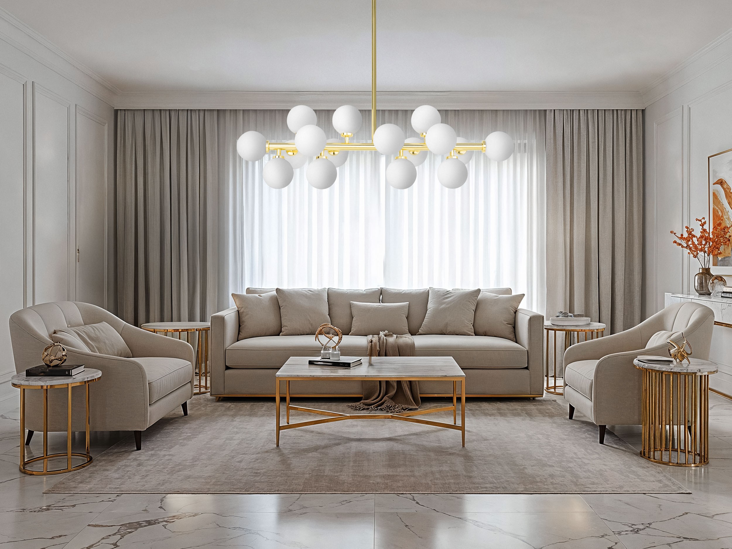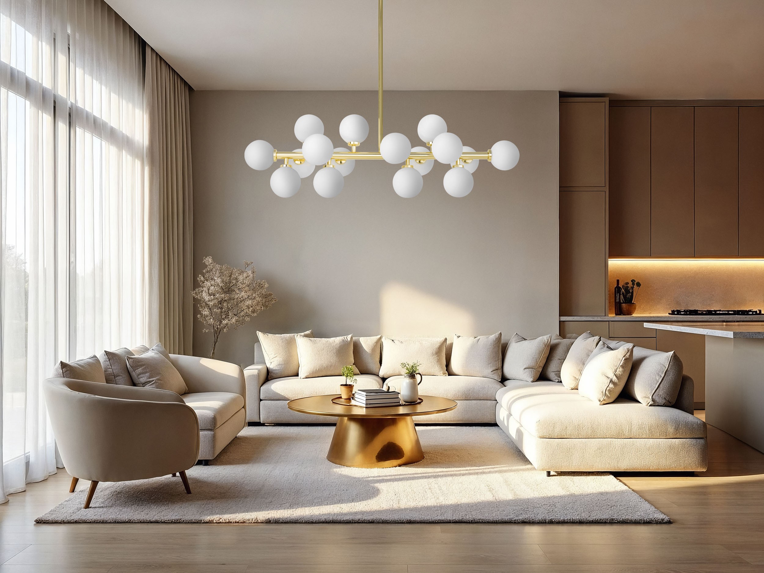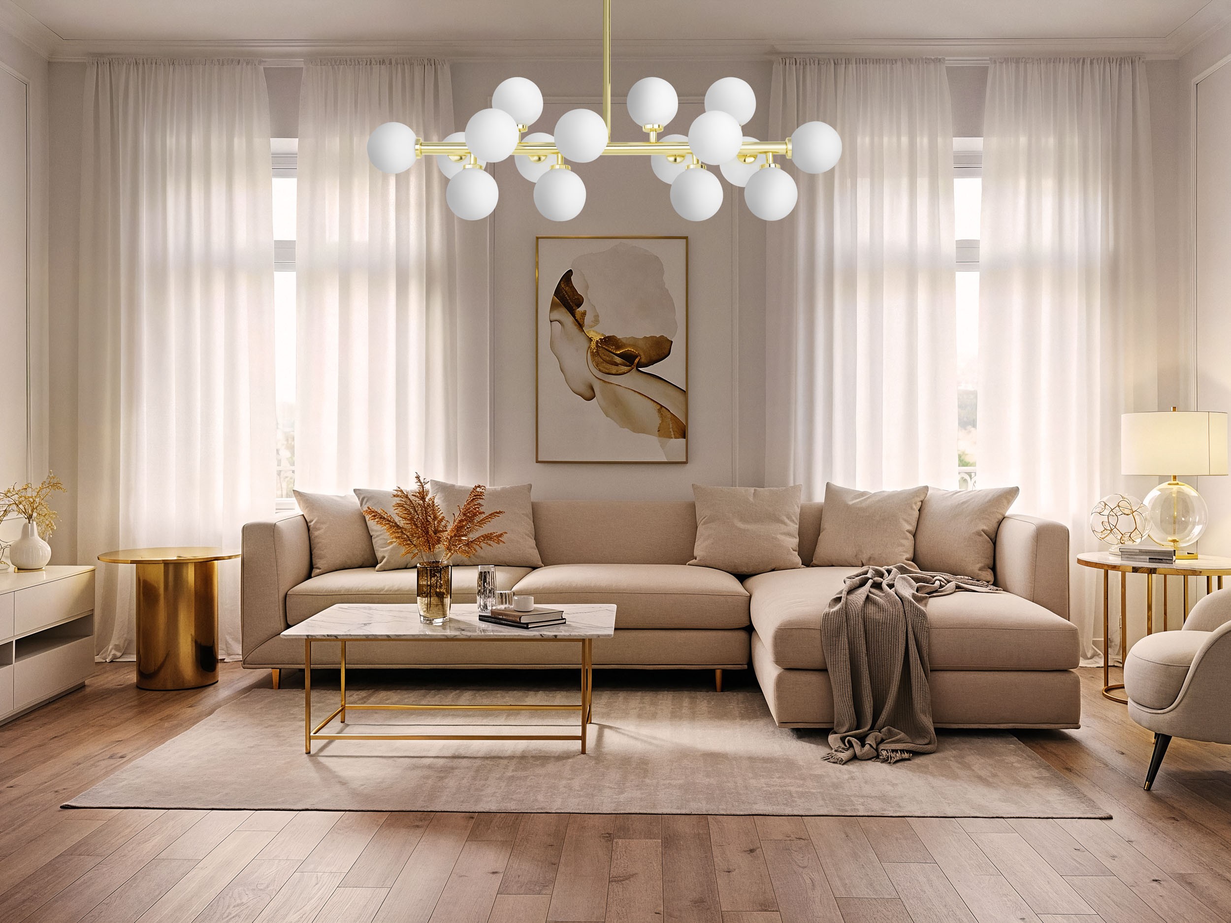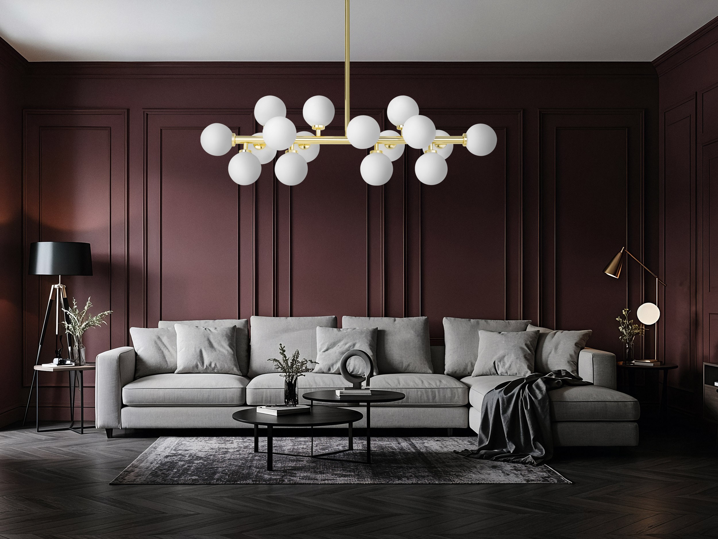 Nowoczesny styl prezentowanego oświetlenia łączy w sobie minimalizm i dekoracyjność. Mimo że te dwie cechy powinny się wykluczać, lampa wisząca Petrica W16 łamie wszelkie stereotypy. Jej luksusowa złota oprawa podtrzymuje aż szesnaście szklanych kloszy, które majestatycznie ozdobią wnętrze niejednego salonu, jadalni, a nawet holu.