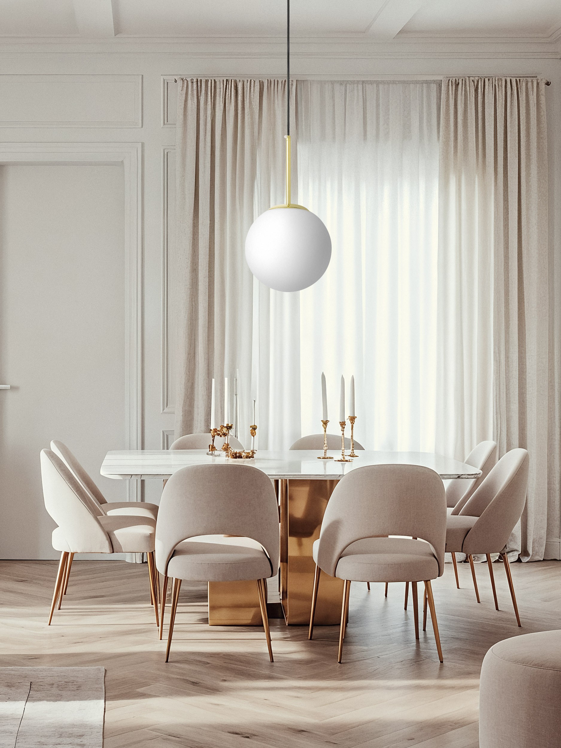 Nowoczesny wygląd wiszącej lampy Fredica D20 spotyka się z biało – złotym, klasycznym połączeniem kolorystycznym w stylu modernistycznym, by stworzyć niepowtarzalny design z nutką luksusu. Połączenie białego matowego klosza ze złotym uchwytem nadaje wyszukany klimat, zapewniając dobre oświetlenie i stylowe dopełnienie wnętrza. Lampa wisząca Fredica sprawdzi się doskonale w klasycznie lub nowocześnie urządzonej jadalni, jak i sypialni czy kuchni.