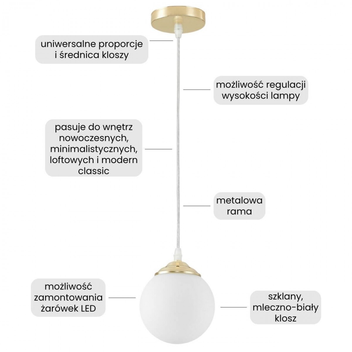 Ta lampa wisząca sprawdzi się jako oświetlenie stołu w kuchni i jadalni, jako pojedynczy punkt nad blatem w roli lampy do kuchni czy nad łóżkiem w sypialni, tworząc przyjemny klimat. Klasyczne złoto nadaje całości luksusowego charakteru, dlatego model równie dobrze pasuje do wnętrz eleganckich, jak i do awangardowych, nowoczesnych aranżacji.
