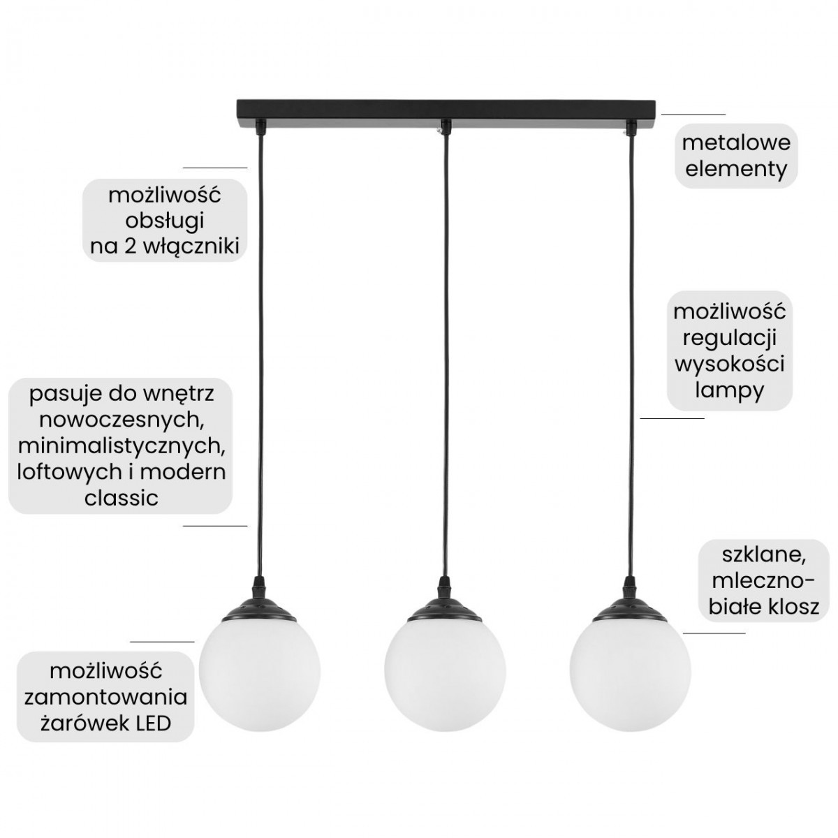 Lampa wisząca FINO W3 w czarnej wersji to propozycja, która łączy prostotę formy z wyrazistym charakterem. Trzy mleczne kule zawieszone na smukłych, czarnych oprawach tworzą elegancki kontrast, który dobrze odnajduje się w aranżacjach nowoczesnych, minimalistycznych i loftowych.