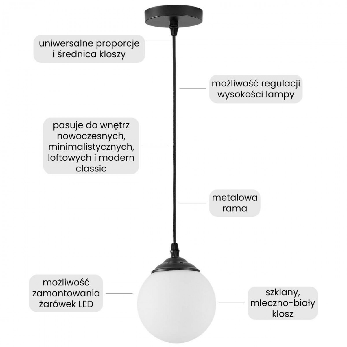 Lampa wisząca FINO W1 w czerni to kompaktowy model z jednym kulistym, białym kloszem z mlecznym wykończeniem. Model emituje równomierne, łagodne światło, które sprawdza się na co dzień - zarówno podczas pracy, jak i wieczornego relaksu. Dzięki swojej uniwersalnej formie ta modna lampa pasuje do mniejszych pomieszczeń, ale w większych aranżacjach można zestawiać ją w szeregu lub grupie, tworząc efektowną kompozycję. Doskonale sprawdza się jako lampa wisząca do kuchni, zdobiąc strefę nad stołem, jak i w roli lampy do sypialni lub salonu, zapewniając spokojny klimat w nowoczesnej formie. Czerń konstrukcji świetnie komponuje się z jasnymi i ciemnymi aranżacjami, a także z różnymi materiałami, od drewna i kamienia po szkło, metal i różne tkaniny.