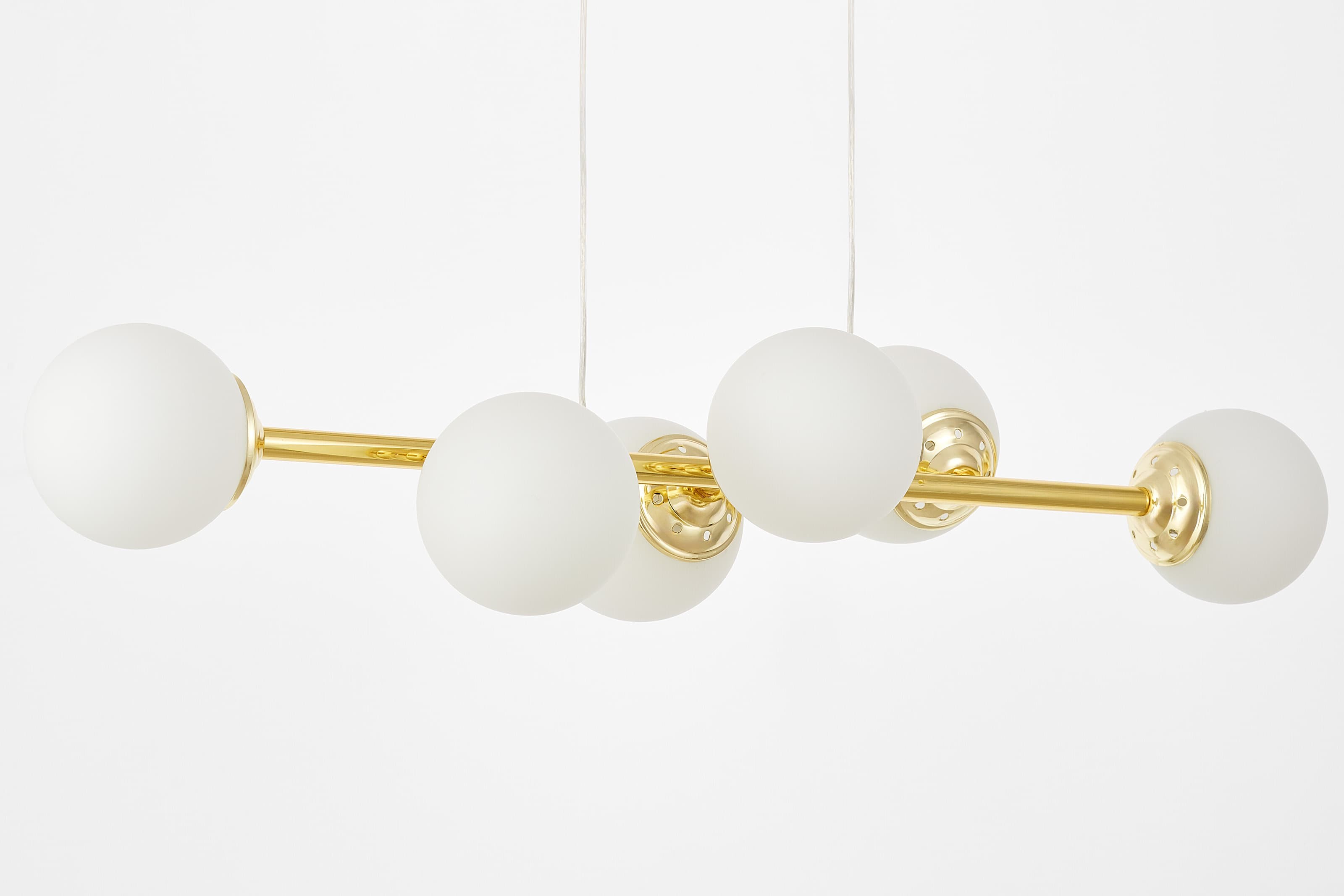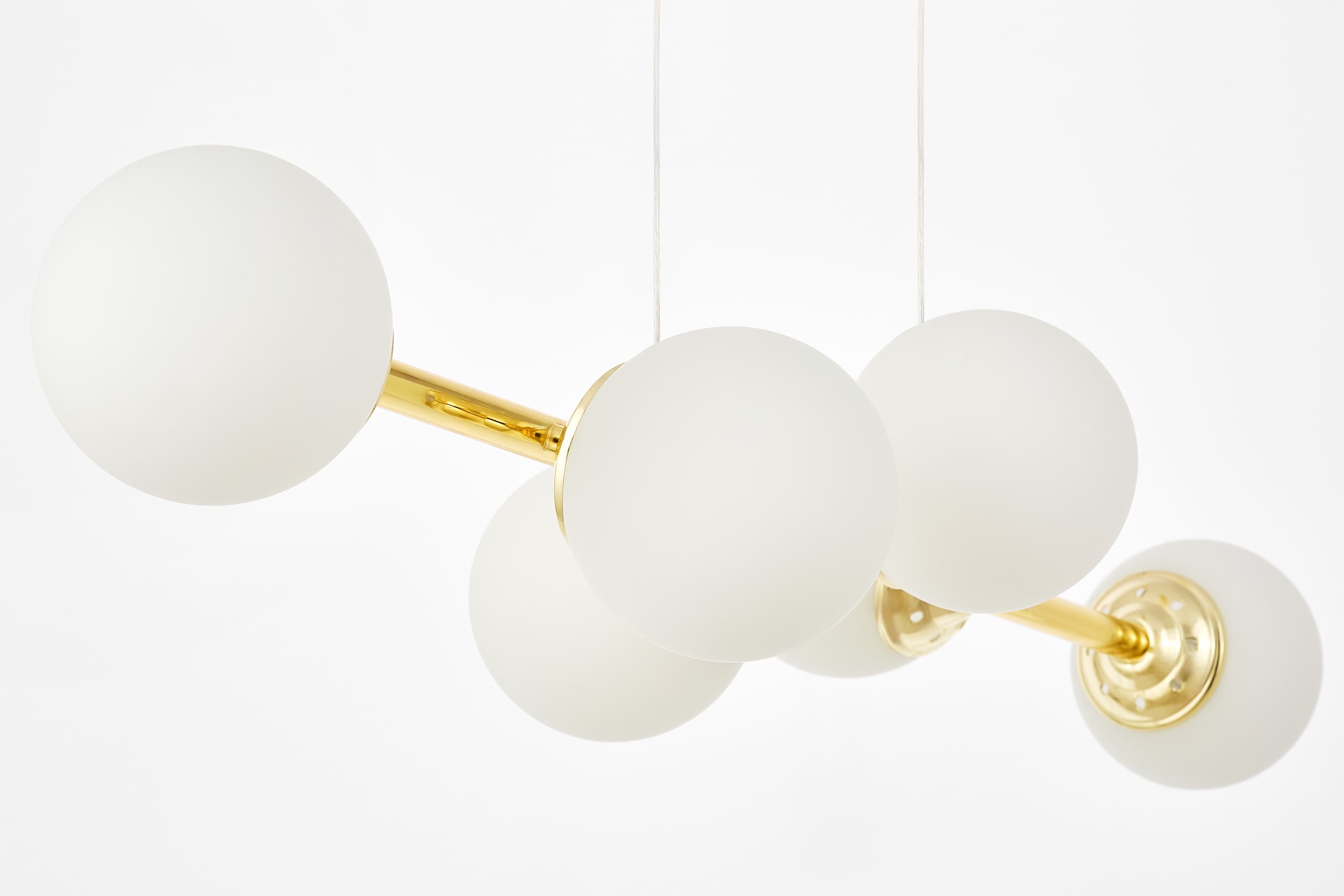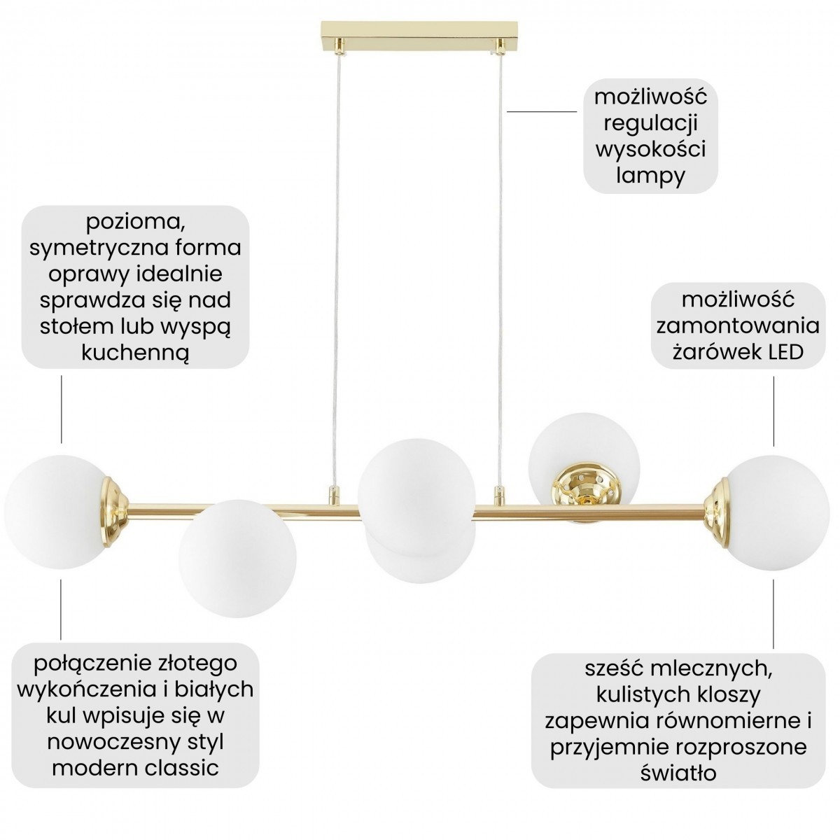 Lampa FINO W6 w klasycznym złocie ma sześć białych, kulistych kloszy rozmieszczonych na smukłej ramie. To model, który łączy dekoracyjny charakter ze światłem równomiernie oświetlającym wnętrze.
