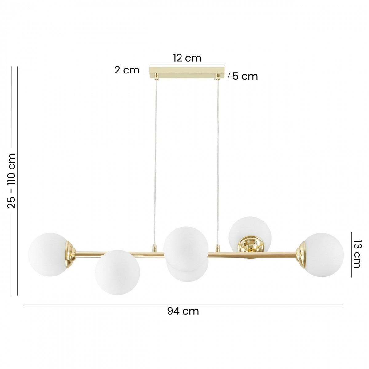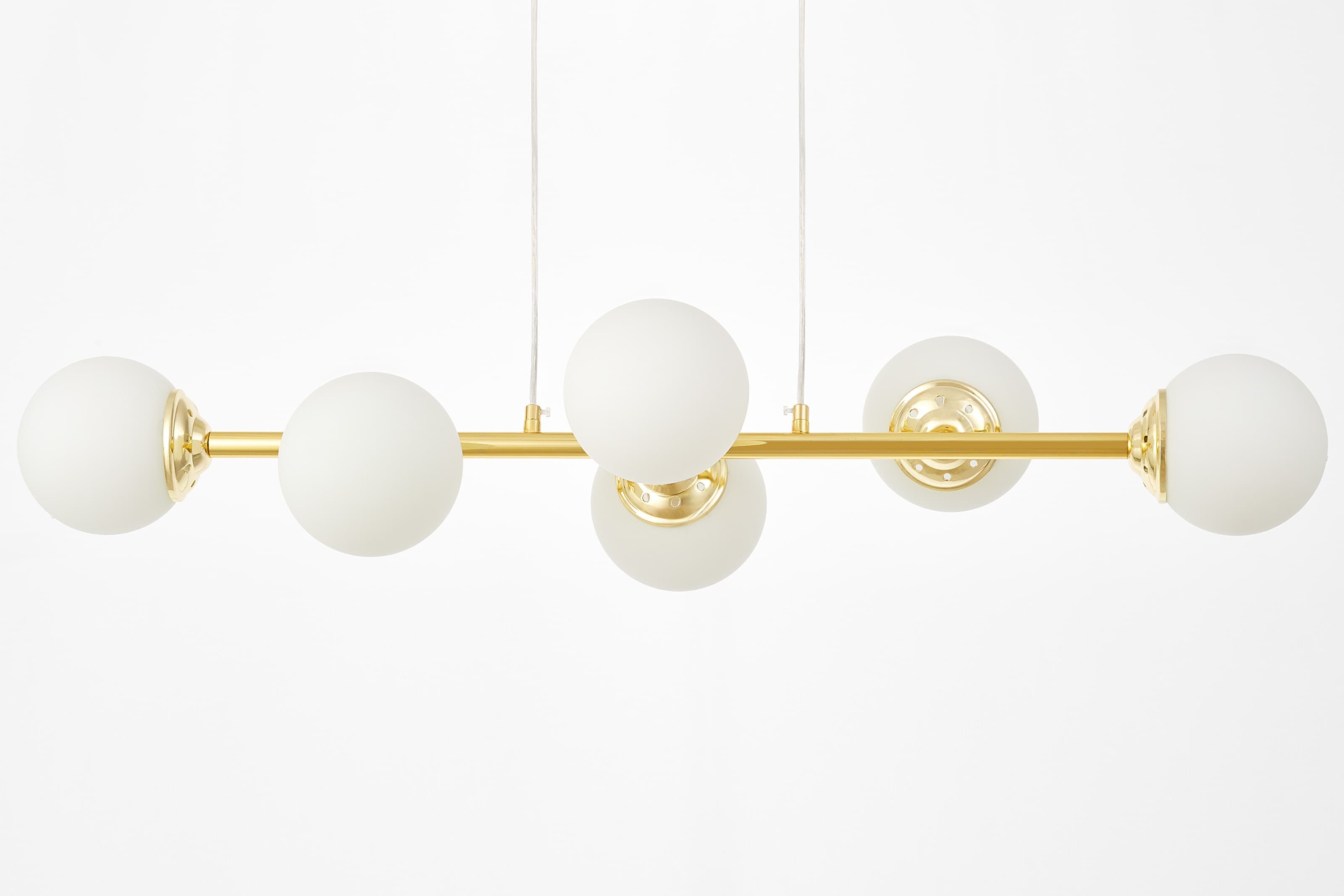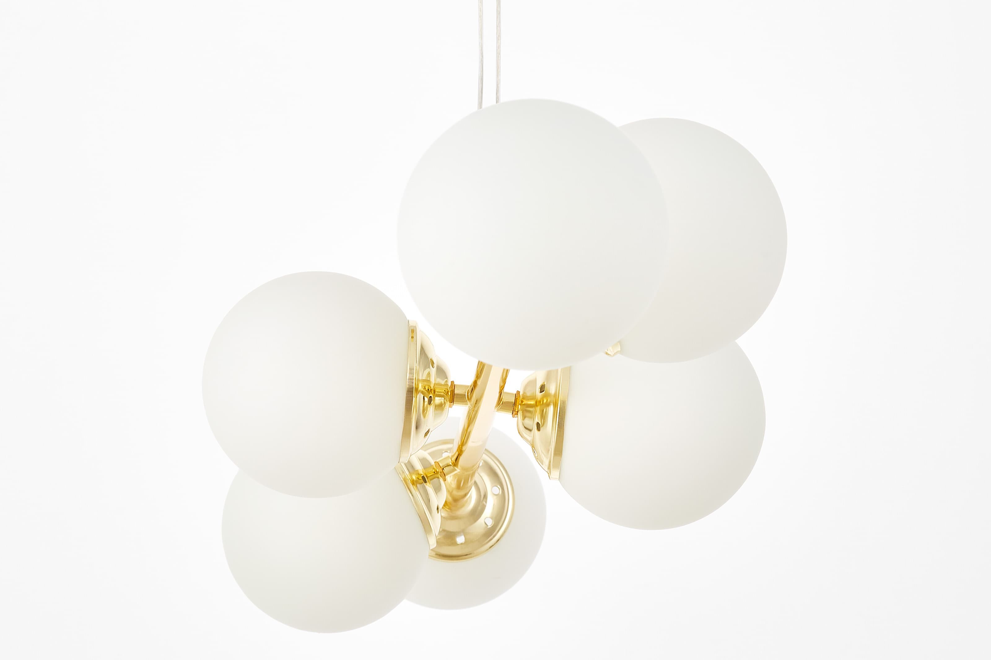 Lampa FINO W6 w klasycznym złocie ma sześć białych, kulistych kloszy rozmieszczonych na smukłej ramie. To model, który łączy dekoracyjny charakter ze światłem równomiernie oświetlającym wnętrze.