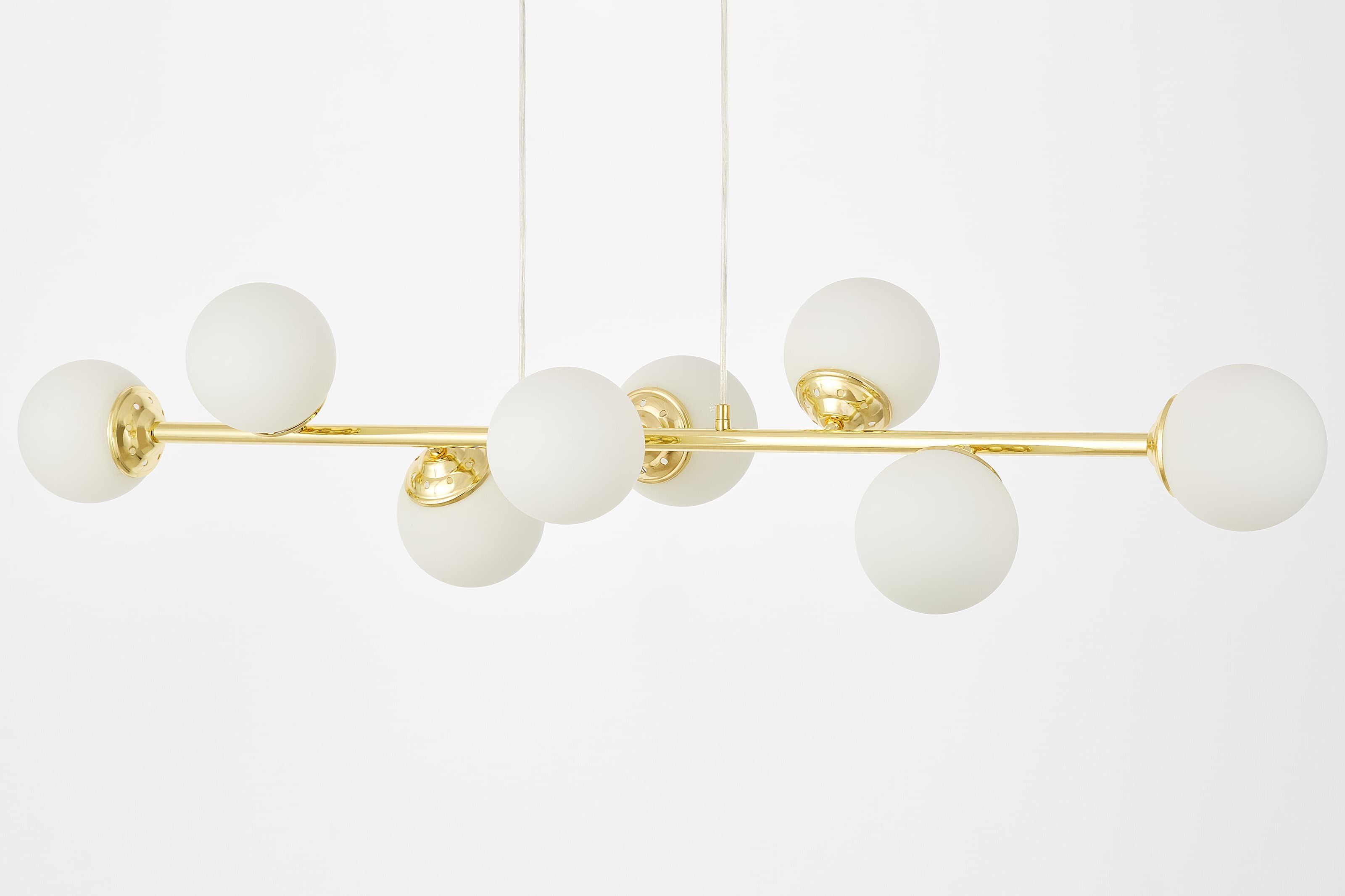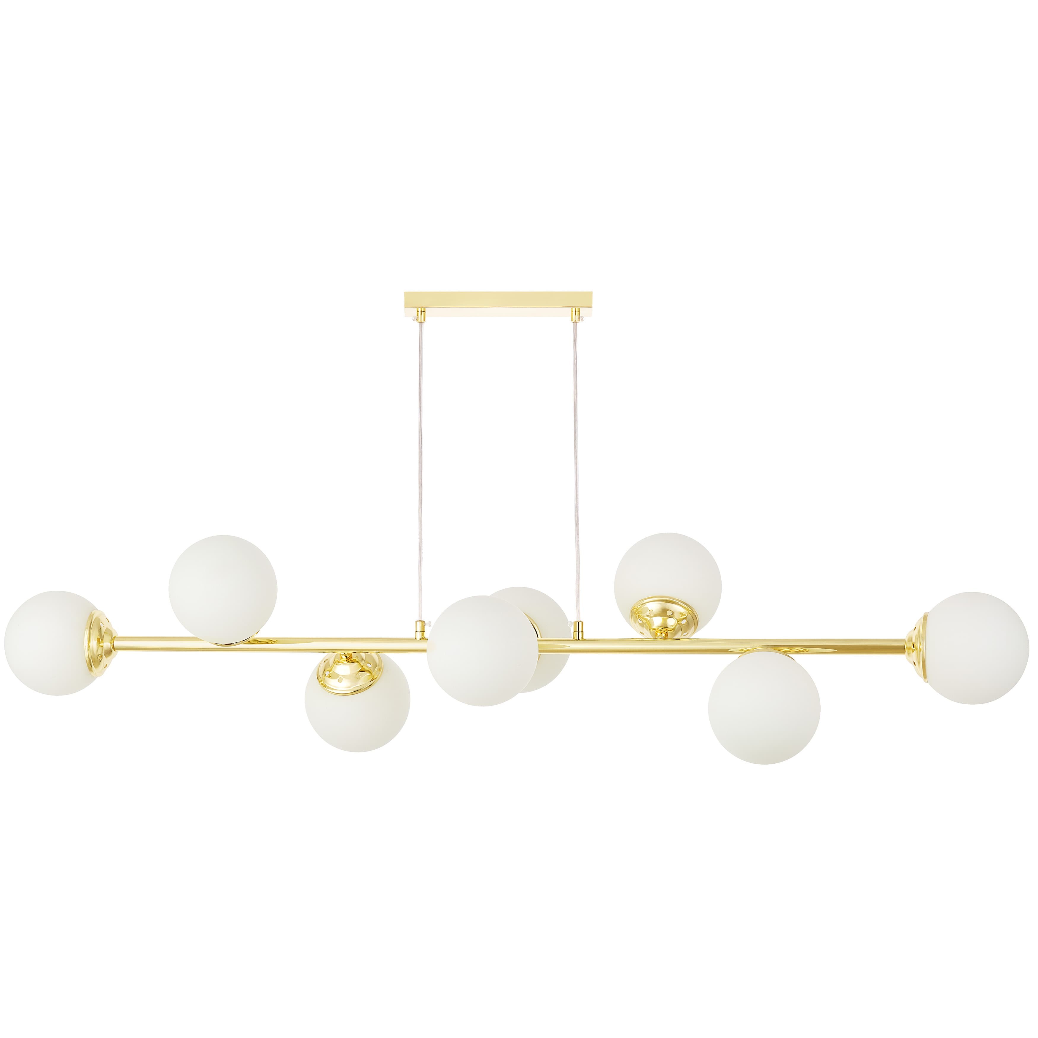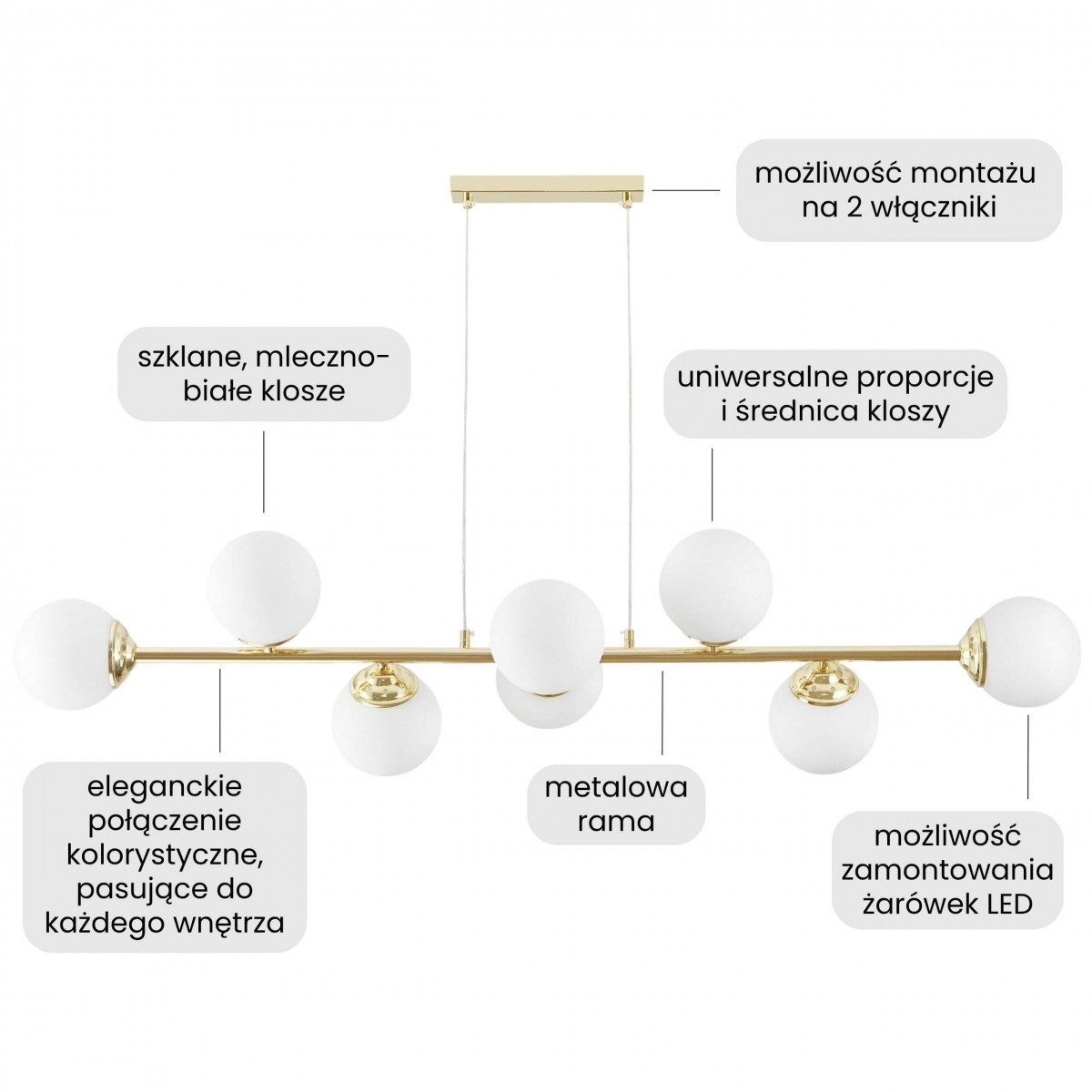 FINO W8 w klasycznym złocie to lampa wisząca, która buduje efekt zaraz po wejściu do pokoju. Cechuje się ośmioma kulistymi kloszami rozmieszczonymi szeroko na złotej ramie, dzięki którym światło rozchodzi się szerzej, więc dużą część pokoju można oświetlić jednym źródłem. Jest to idealne rozwiązanie do salonów z wysokimi sufitami, kuchni czy otwartych jadalni.