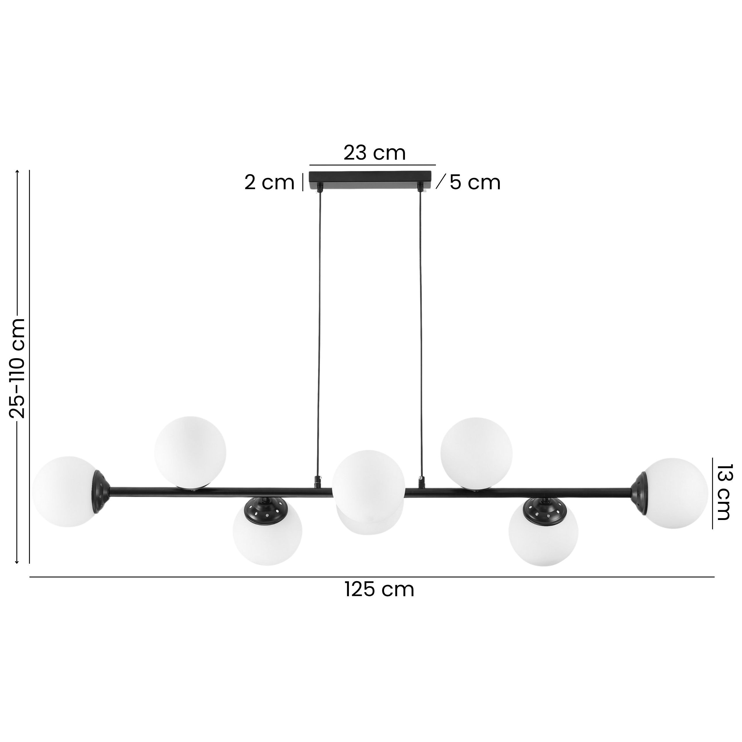 FINO W8 w czarnym wykończeniu to nowoczesna lampa wisząca stworzona do dużych wnętrz, w których jeden model ma zastąpić kilka mniejszych opraw. Osiem kulistych kloszy wykonanych z mlecznego szkła rozmieszczono tak, aby równomiernie rozświetlały całe pomieszczenie. Dzięki temu w salonie nie trzeba dodatkowych lamp, a jako lampa do kuchni i jadalni sprawia, że przestrzeń nad stołem staje się wyraźnie doświetlona i przyjazna w codziennym użytkowaniu.