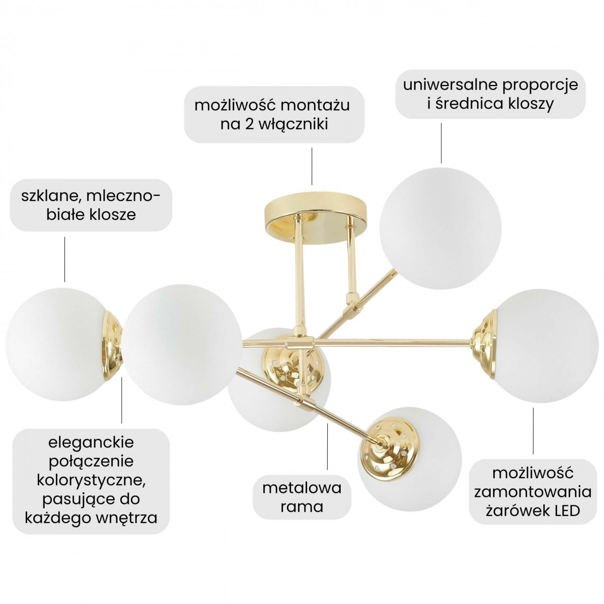 Lampa wisząca FINO W6 w klasycznym złocie łączy sześć mlecznych kul z wyraźną, dekoracyjną oprawą. Szlachetny kolor podkreśla charakter wnętrz o różnym stylu - od modern classic po współczesne aranżacje.
