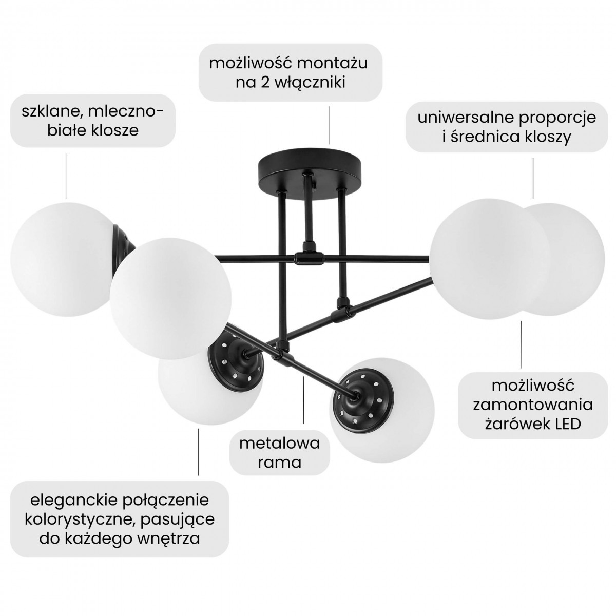 Sześć białych kul rozmieszczonych symetrycznie na czarnej oprawie daje efekt, który od razu przyciąga uwagę, ale nie dominuje wystroju. Światło rozchodzi się równo po całym pomieszczeniu, co na co dzień przekłada się na komfort - od pracy przy laptopie, przez zabawę z dziećmi, po wieczorne rozmowy.