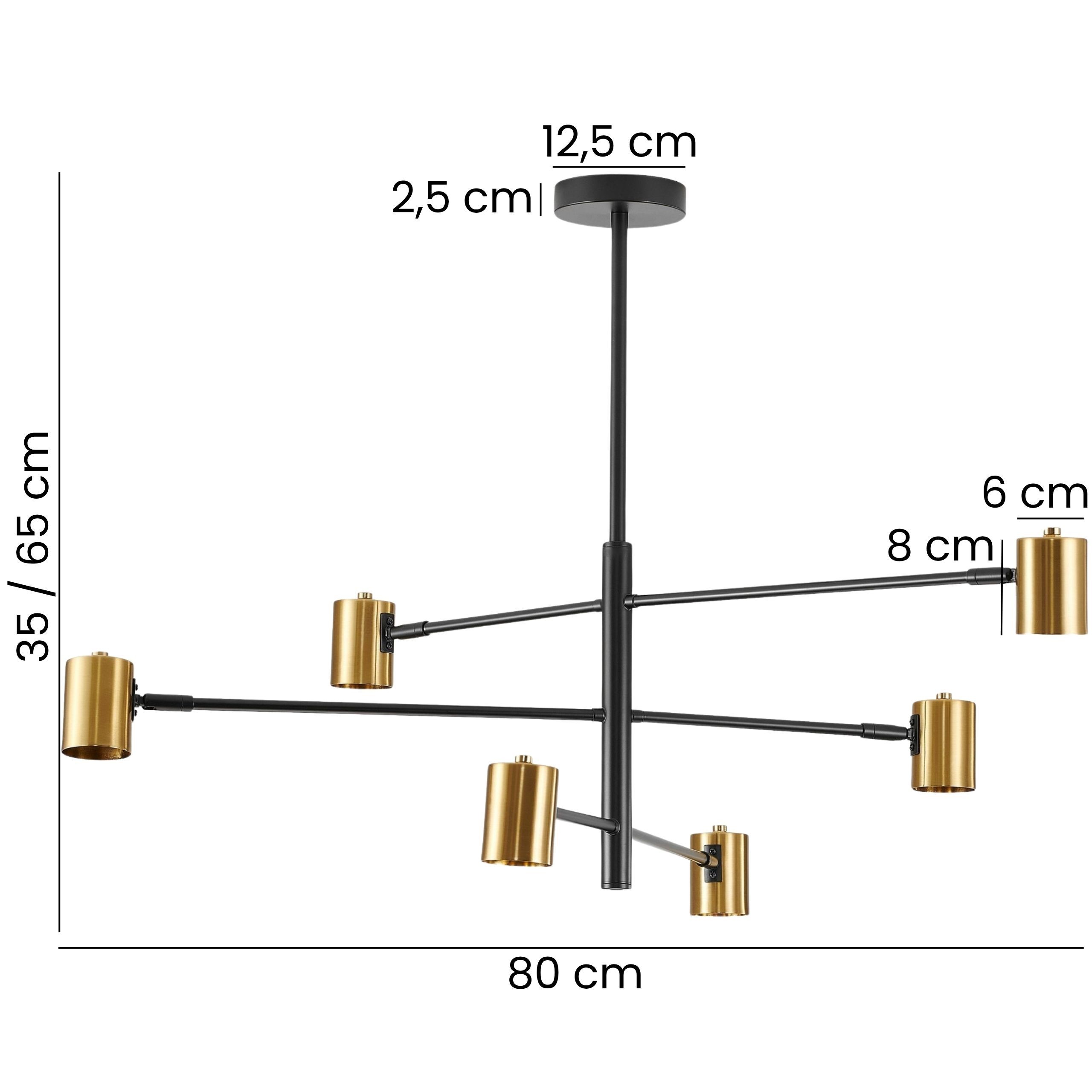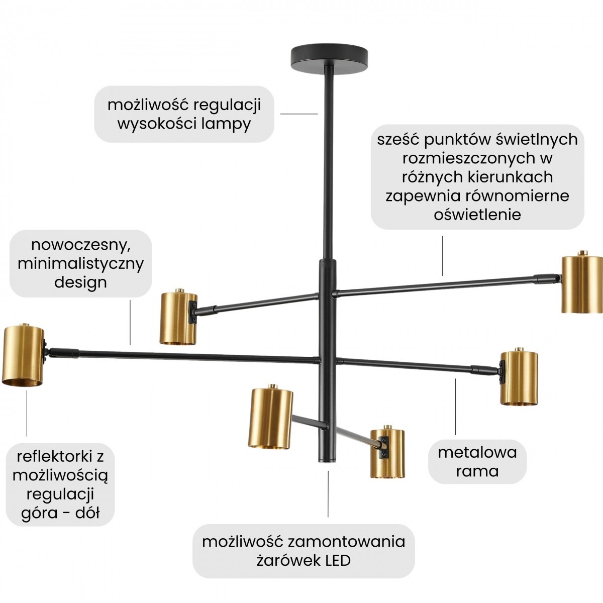Nowoczesna lampa wisząca DORA W6 w czarno-złotym wykończeniu to propozycja dla miłośników elegancji z nutą industrialnego charakteru. Sześć reflektorków na ramionach o dwóch tonacjach (czarnej i złotej) daje możliwość sterowania światłem, a zarazem stanowi wyrazisty detal dekoracyjny.