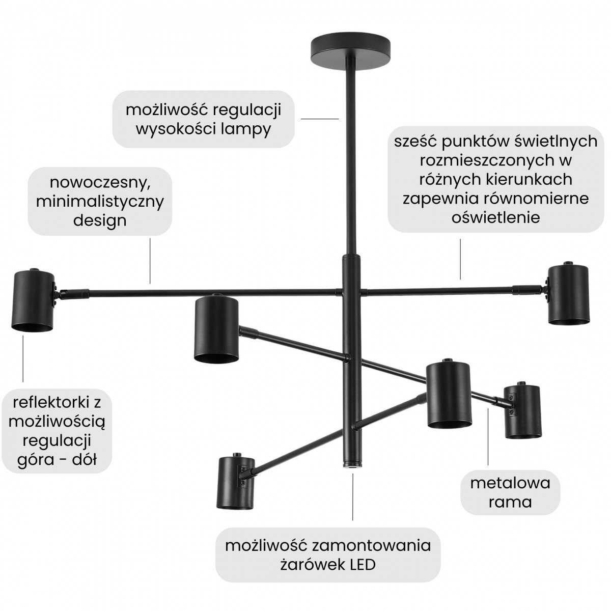 Lampa wisząca DORA W6 w czerni wykorzystuje sześć metalowych kloszy o charakterze reflektorów na regulowanych ramionach. Możliwość ukierunkowania światła pozwala dopasować oświetlenie do zadań - od ekspozycji detali po doświetlenie strefy dziennej.