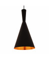 Industrialna kolekcja oświetlenia FOGGI 12C to zestawienie produktów o oryginalnym wykończeniu, które swoją subtelnością podkreślają elegancję projektu, z zarazem nowoczesność, w myśl której zostały wykonane. Spłaszczona bryła, bazująca na kształcie leja, pokryta została czarną barwą o atrakcyjnym, matowym wykończeniu. Ta stonowana kolorystyka klosza przełamana została ciepłym, złotym odcieniem farby, pokrywającej jego wnętrze. Charakterystyczna w prezentowanym modelu jest mocno wyeksponowana żarówka, co dostrzegalne jest przede wszystkim w modelach oświetlenia nurtu loftowego. Nowoczesność zaś reprezentuje bryła klosza o wąskiej górze, rozszerzającej się dość ekspresyjnie w dolnej części bryły. Na dole widać oryginalne podwinięcie aluminiowego materiału lampy, które tworzy swoistą jej dekorację, ale też pozwala na łatwiejszą konserwację i czyszczenie produktu. Funkcjonalizm lampy wiszącej przejawia się w regulowanej wysokości czarnego, elastycznego kabla.