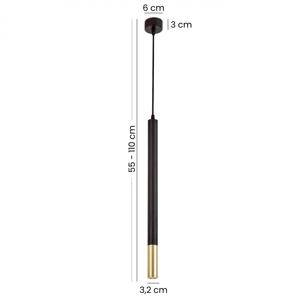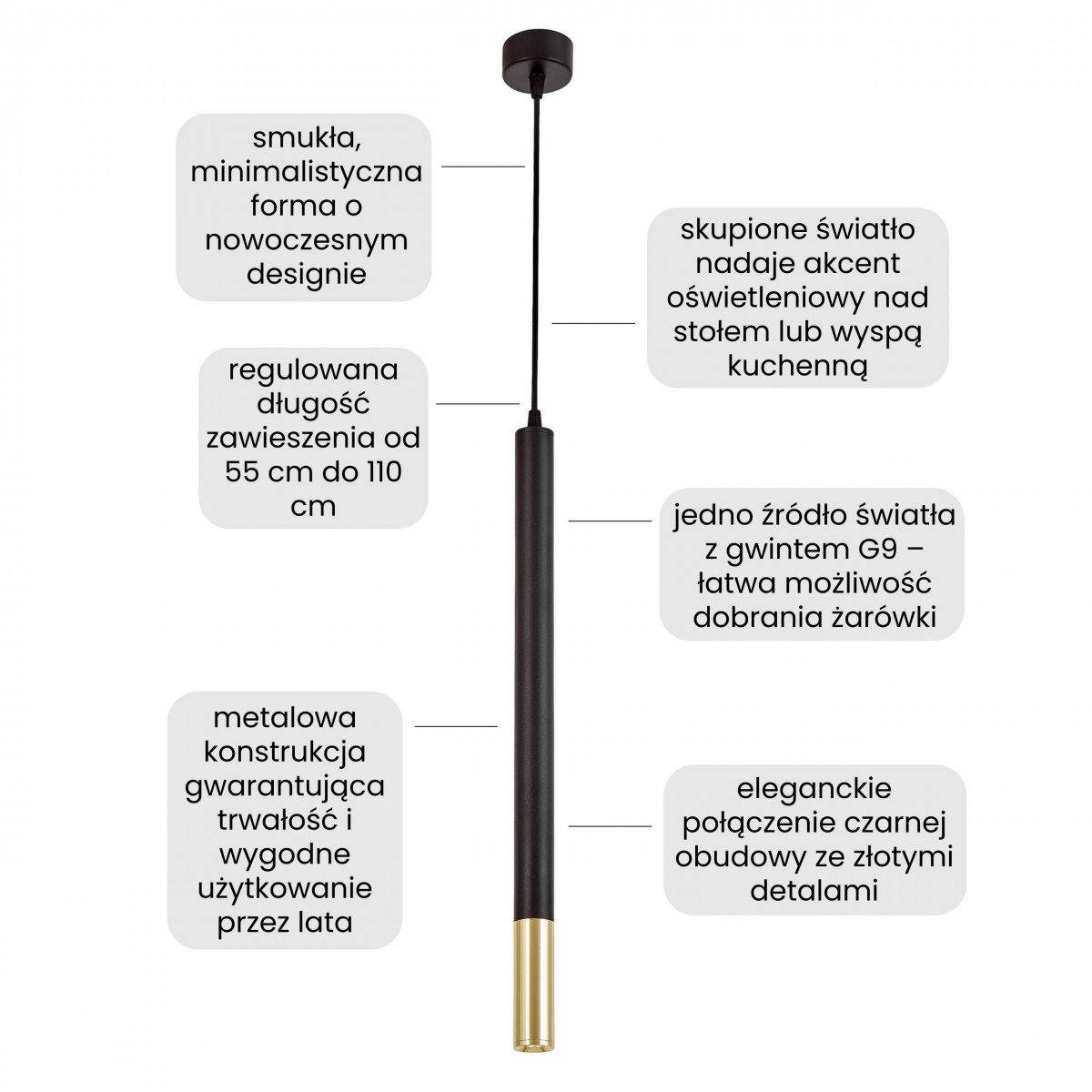 Jeśli szukasz oświetlenia, które połączy nowoczesny minimalizm z odrobiną luksusu, model w formie tuby będzie świetnym wyborem. Ta czarna lampa wisząca to metalowa, 50-centymetrowa rurka zakończona złotym, błyszczącym elementem. Ma zaledwie 3,2 cm szerokości, co czyni ją jednym z najzgrabniejszych modeli na rynku, idealnym do mieszkań, w których cenimy przestrzeń i minimalizm.