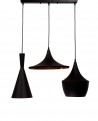 Czarno-złota odsłona kolekcji FOGGI W3 to idealnie dobrane produkty oświetleniowe mogące udekorować wnętrze tak, by całkowicie je odmienić, nadając mu surowego, awangardowego charakteru tak mocno związanego ze stylem loft. Potrójna lampa wisząca zawiera w sobie tak naprawdę trzy odrębne, różniące się od siebie, a pomimo to pasujące do siebie klosze. Każdy z nich wykonany został z aluminium, co powoduje, że mimo dużych rozmiarów i wielu różnorodnych elementów, lampa pozostaje lekka, nie obciąża konstrukcji sufitu. Klosze wykonane są zgodnie z oryginalnym projektem, zakładającym proste, geometryczne linie bazujące na cylindrycznych kształtach oraz okręgach. Dwa klosze posiadają bryłę o nieco zamkniętych formach, oddając przy tym nastrojowe, przygaszone światło, zaś trzeci klosz odsłania całe swoje wnętrze, tworząc perfekcyjne źródło wyrazistego światła. Industrializm lampy podkreślony został piękną, dostoją kolorystyką opartą na czerni i złocie. Model dopełnia tradycyjna, prosta podsufitka oraz wykonany w tym samym tonie czarny, regulowanej długości kabel.