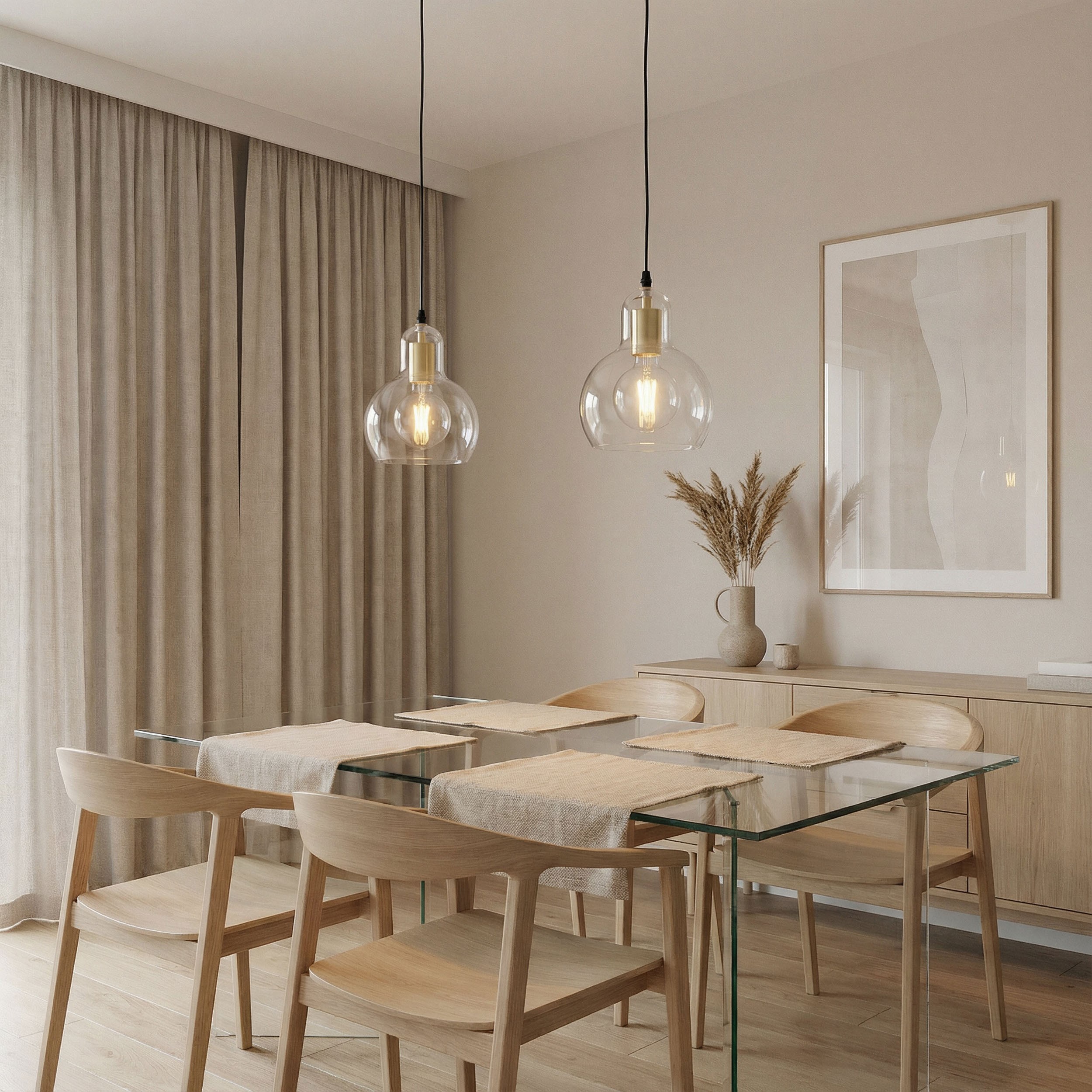 MORO 1A nowoczesna lampa wisząca ze szklanym kloszem w ciekawym kształcie zwisającym na cienkiej lince. Model posiada transparentny klosz, który nie ogranicza pracy żarówki, dzięki czemu światło doskonale oświetla wybrane miejsce. Rozwiązanie wyróżnia się złotymi detalami u podstawy i w środku klosza, które dodają lampie elegancji, co sprawdza się w przestrzeniach, w których liczy się przyjemna atmosfera: model sprawdza się jako lampa do kuchni, jadalni czy strefy pracy. To oświetlenie, które towarzyszy codziennym czynnościom, ale jednocześnie wpływa na pozytywny odbiór wnętrza.