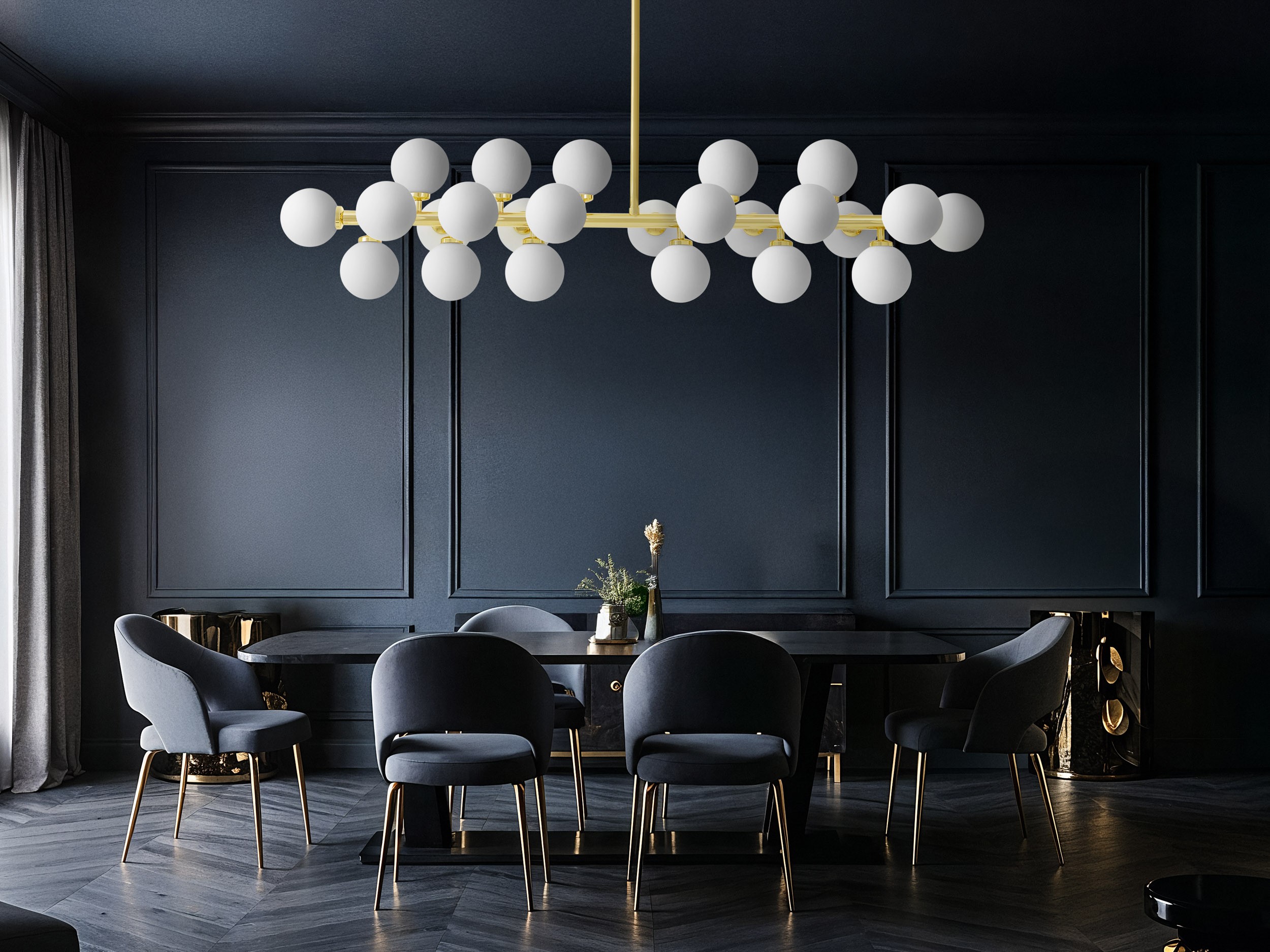 Lampa wisząca Petrica W24 w złotej kolorystyce jest symbolem elegancji i nowoczesności w świecie oświetlenia. Złote wykończenie w połączeniu z az 24 białymi, szklanymi kloszami nadaje jej wyjątkowej prezencji, która ozdobi każde wnętrze. Na eleganckiej, poziomej ramie rozmieszczone klosze tworzą imponujący efekt świetlny, nie tylko oświetlając przestrzeń, ale również stanowiąc dekoracyjny element. Regulowane ramiona pozwalają dostosować wysokość lampy do indywidualnych potrzeb, czyniąc ją wszechstronnie funkcjonalną.