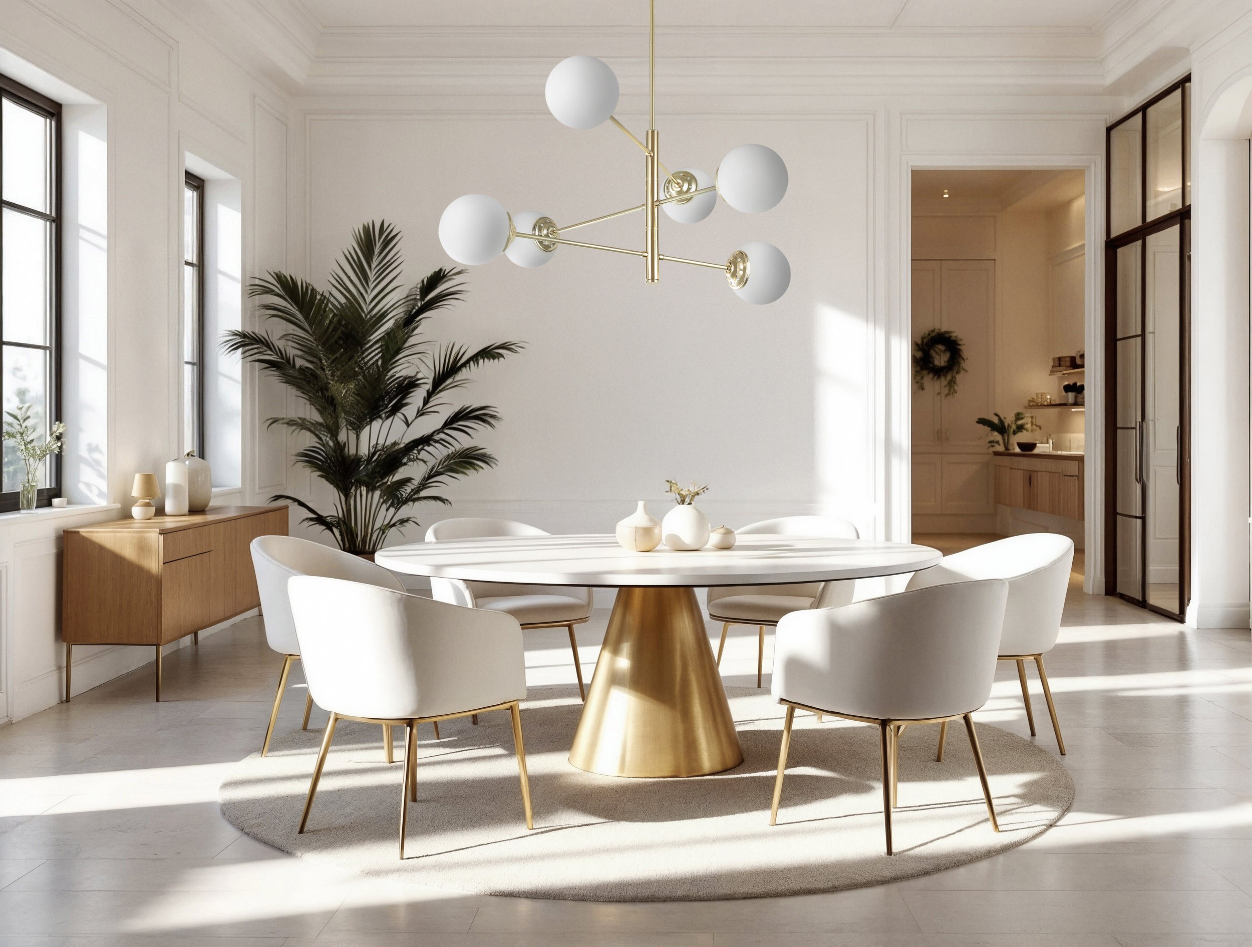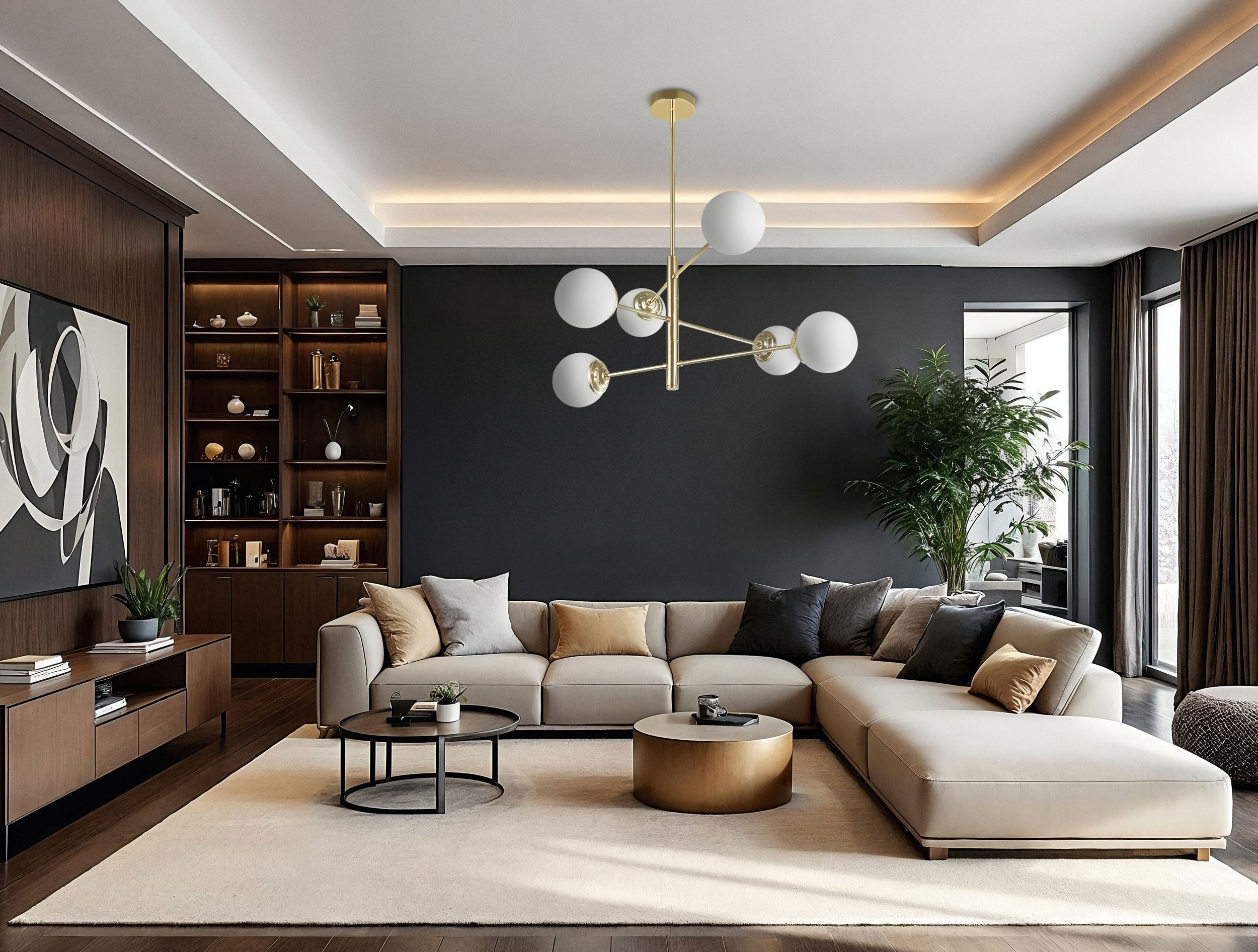 Złoty żyrandol FINO 6 prezentuje się jako stylowa, nowoczesna kompozycja. Sześć kulistych kloszy z mlecznego szkła osadzono na subtelnej oprawie w złotym odcieniu. Geometryczna konstrukcja sprawia, że światło rozchodzi się z łagodną równowagą, pomagając w codziennych czynnościach i wieczornym relaksie.