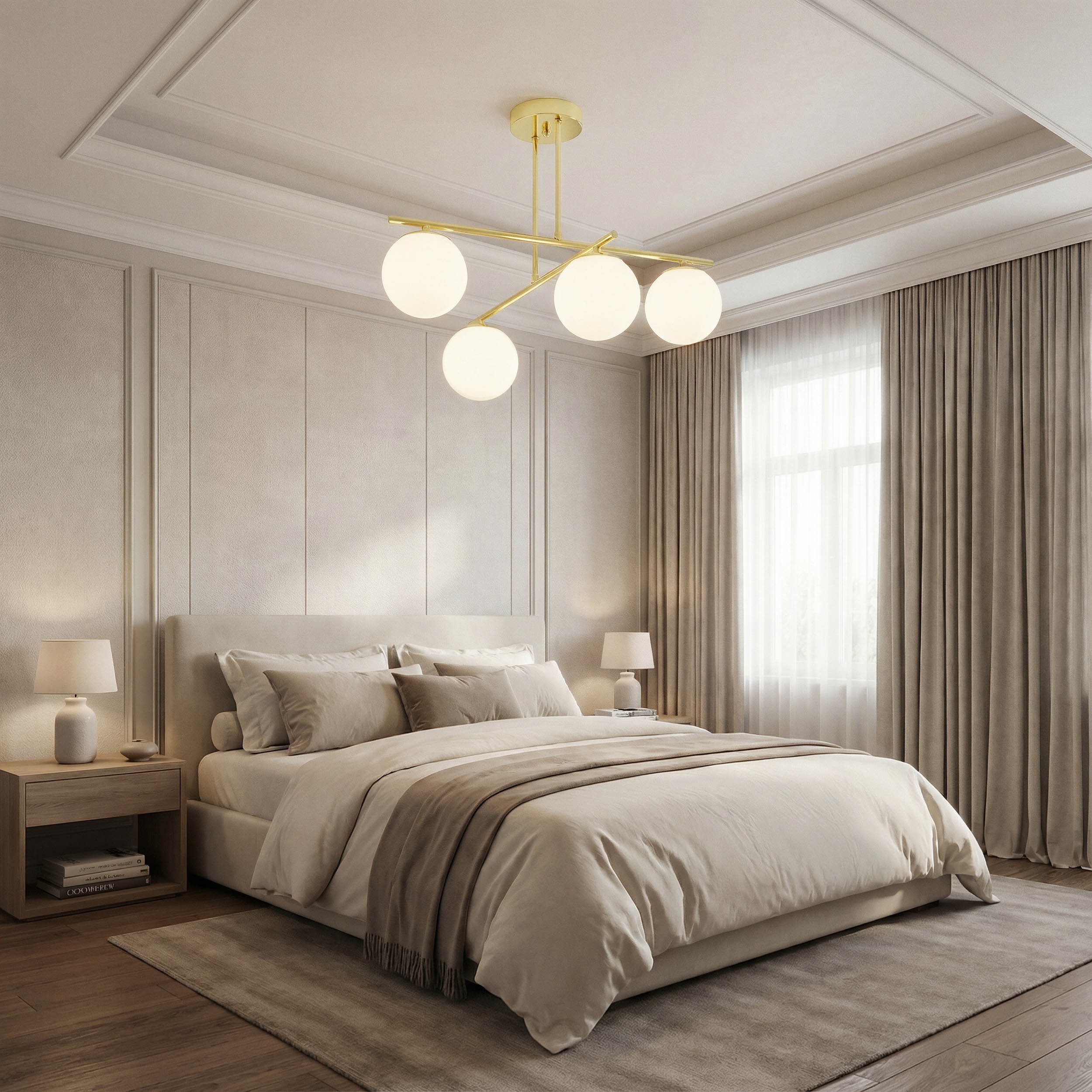 Lampa sufitowa w kolorze złotym to najlepszy dowód na to, że prostota i ozdoba mogą iść w parze. Cztery klosze w kształcie kul rozmieszczone symetrycznie na smukłej ramie dają światło równomierne i komfortowe. Dzięki temu wnętrze staje się jasne, przyjazne i funkcjonalne na co dzień. Lampa może działać w dwóch sekcjach, uruchamianych włącznikiem dwuprzyciskowym.