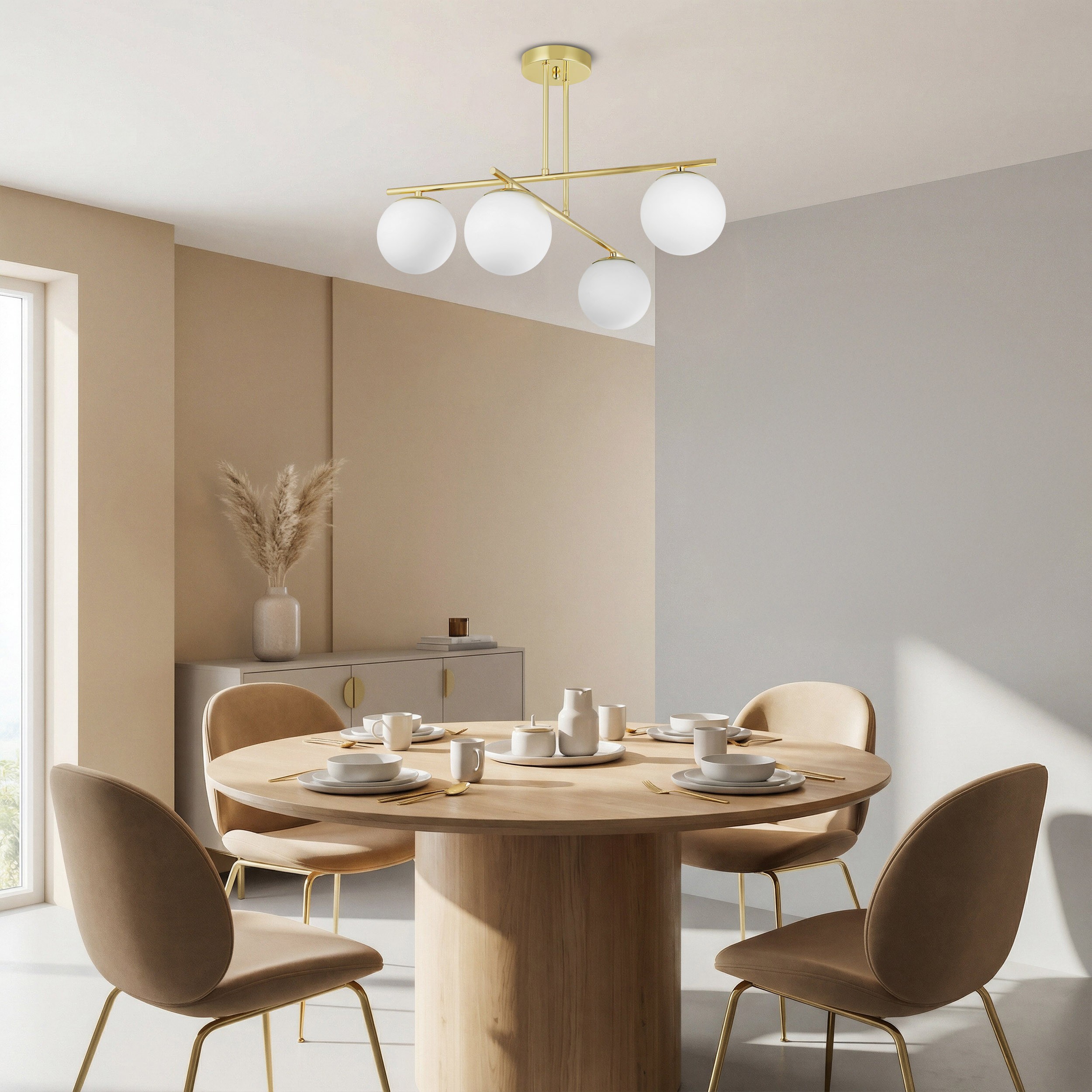 Lampa wisząca złota z mlecznymi kulami w kuchni ułatwia gotowanie i wyznacza strefę posiłków. Jako lampa wisząca do salonu pozwala skupić się na wspólnych chwilach w przyjemnej atmosferze. W sypialni LEDO daje komfortowe światło, umilające start i końcówkę każdego dnia. Złoto ociepla aranżację i wnosi szczyptę elegancji, która pasuje do drewna, jasnych tkanin, marmuru czy szkła. LEDO W4 sprawdza się w małych mieszkaniach, gdzie każdy detal ma znaczenie, ale też w większych przestrzeniach w formie ciekawej lampy loft.