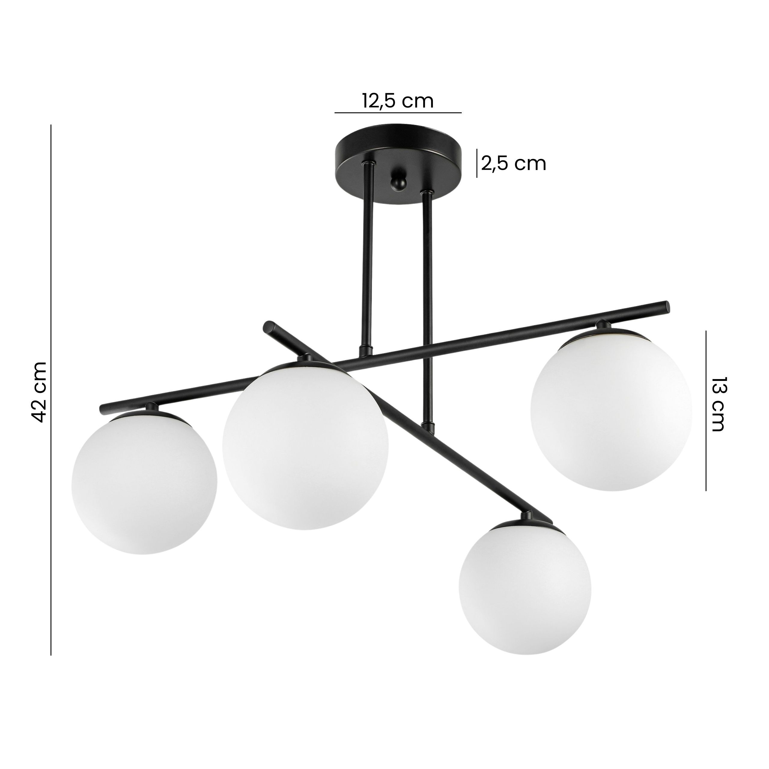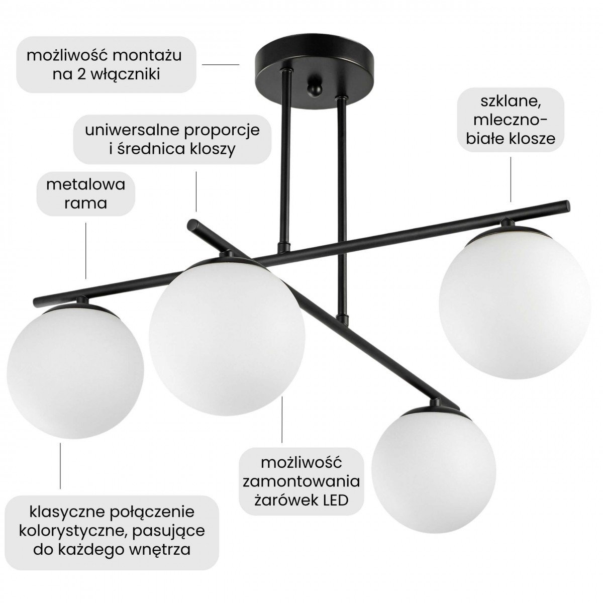 Lampa wisząca LEDO W4 w czerni to cztery mleczne kule na geometrycznej, lekkiej ramie. Zestawienie czerni i bieli daje wyrazisty efekt, który łatwo wpisać w loft, minimalizm lub klasykę w nowoczesnym wydaniu.