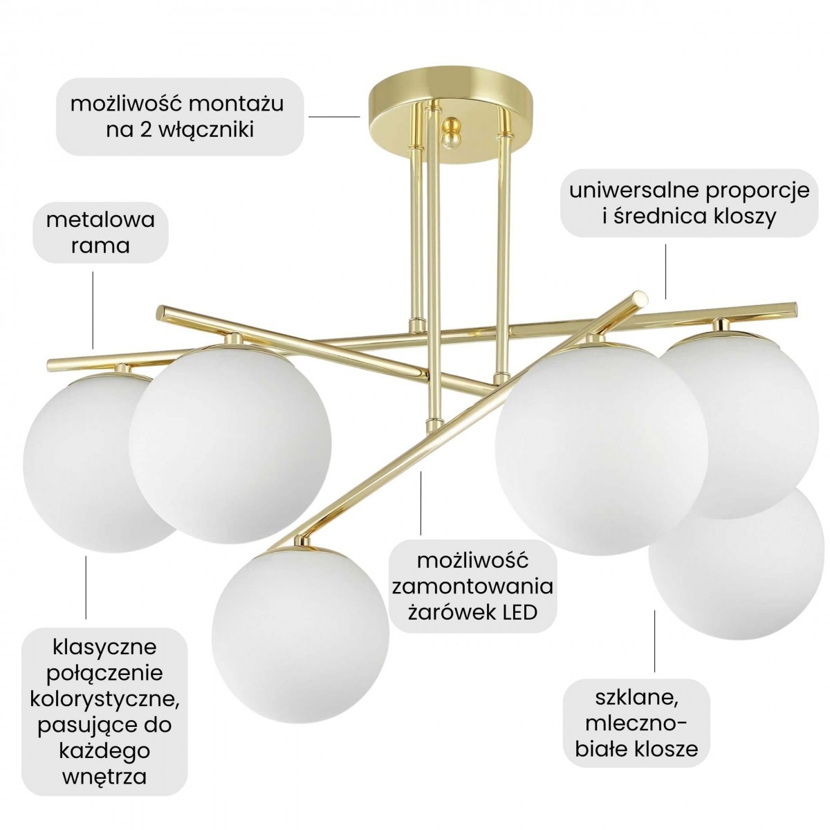 LEDO W6 to lampa wisząca, która przyciąga uwagę od pierwszego spojrzenia. Sześć białych kulistych kloszy umieszczonych na złotej oprawie stwarza efekt harmonii. Średnica lampy jest na tyle spora, że dobrze oświetla większy salon, ale konstrukcja pozwala też na dopełnienie przestrzeni jadalni połączonej z kuchnią.