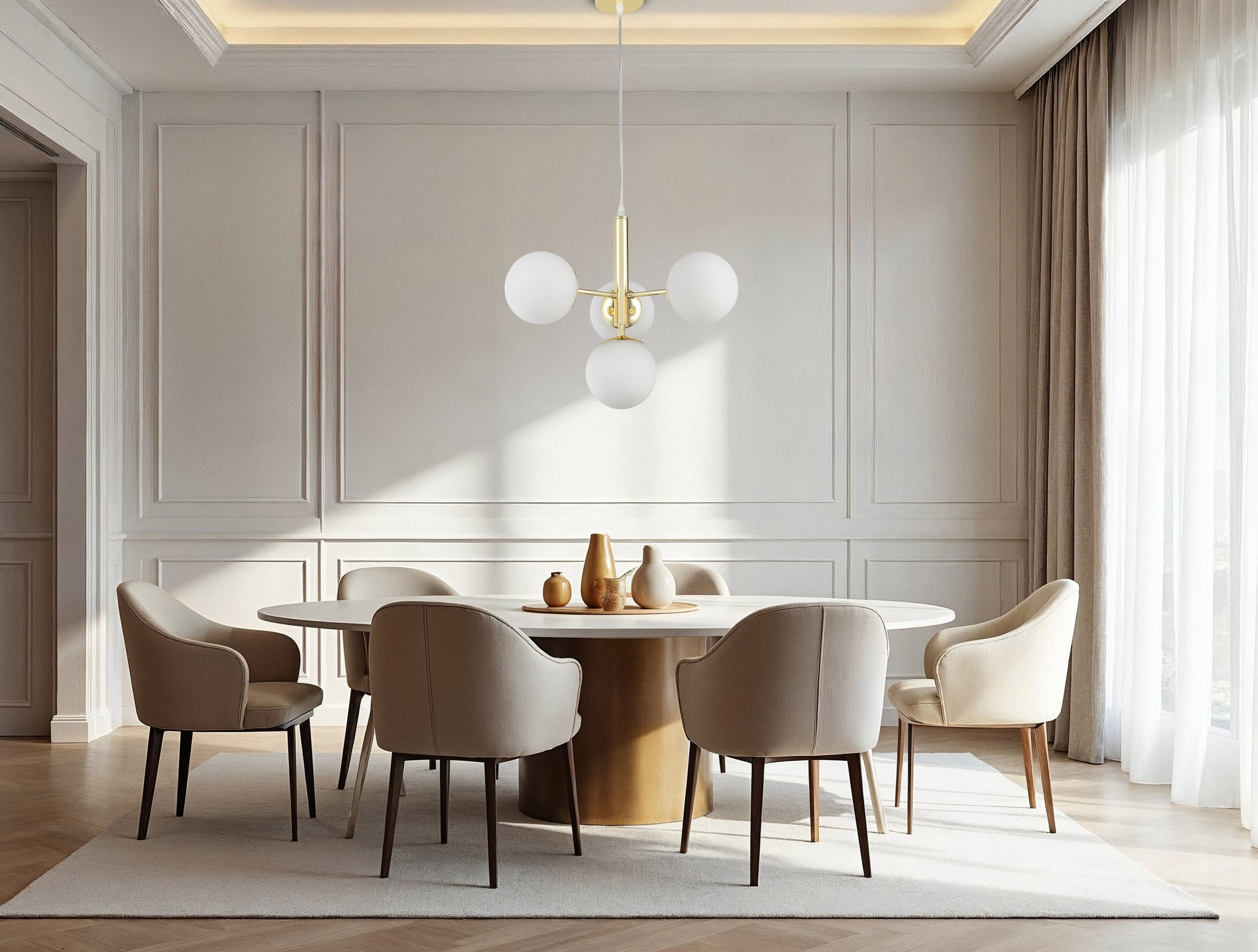 Złota lampa wisząca LEDO 4 zachwyca minimalistycznymi proporcjami i eleganckim detalem. Jej konstrukcja jest zwarta, ale efektowna – cztery kule wokół złotego trzonu tworzą kompozycję, która doskonale wygląda zarówno w świetle dziennym, jak i po zmroku. W kuchni wprowadza klimat sprzyjający bliskości podczas wspólnych posiłków. Jako lampa wisząca do salonu staje się dyskretną ozdobą w głównej strefie, a w sypialni sprzyja odprężeniu i gwarantuje światło ułatwiające wyciszenie.