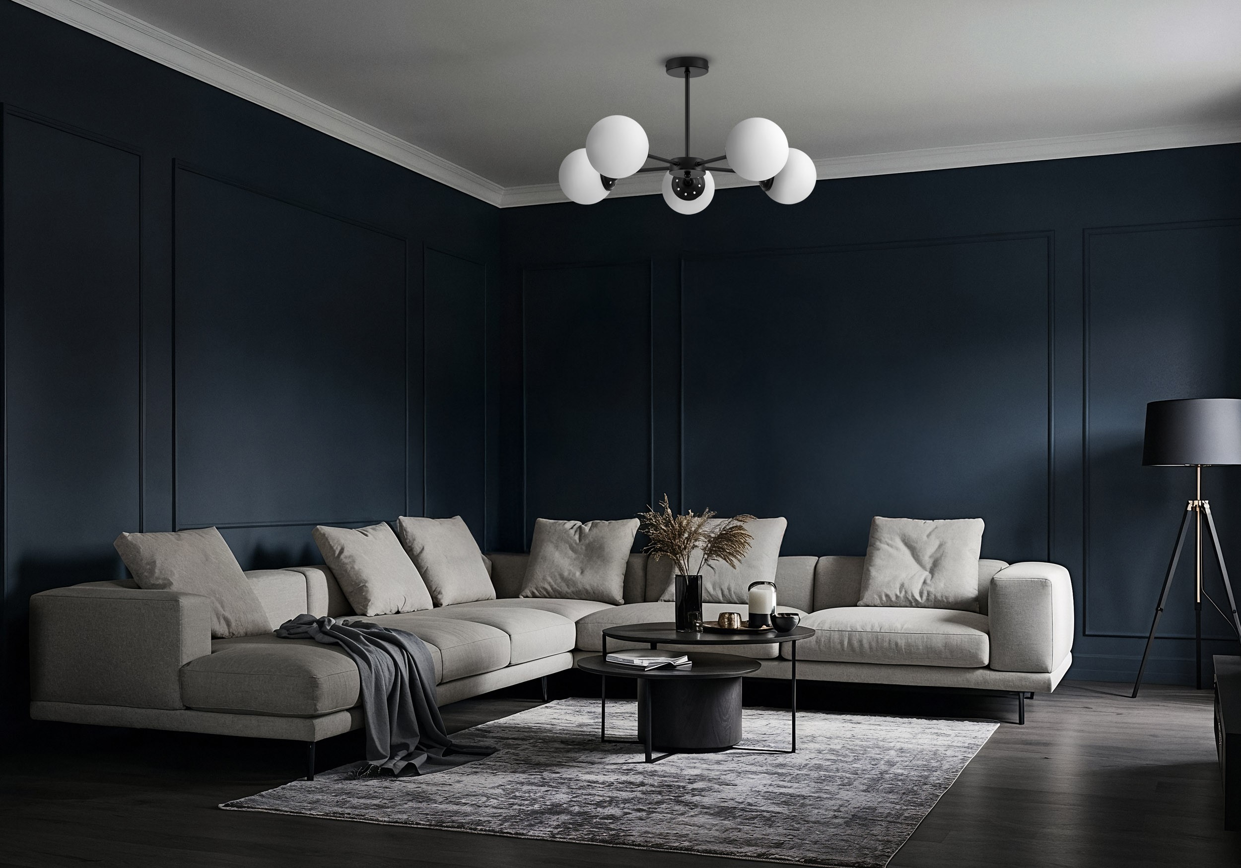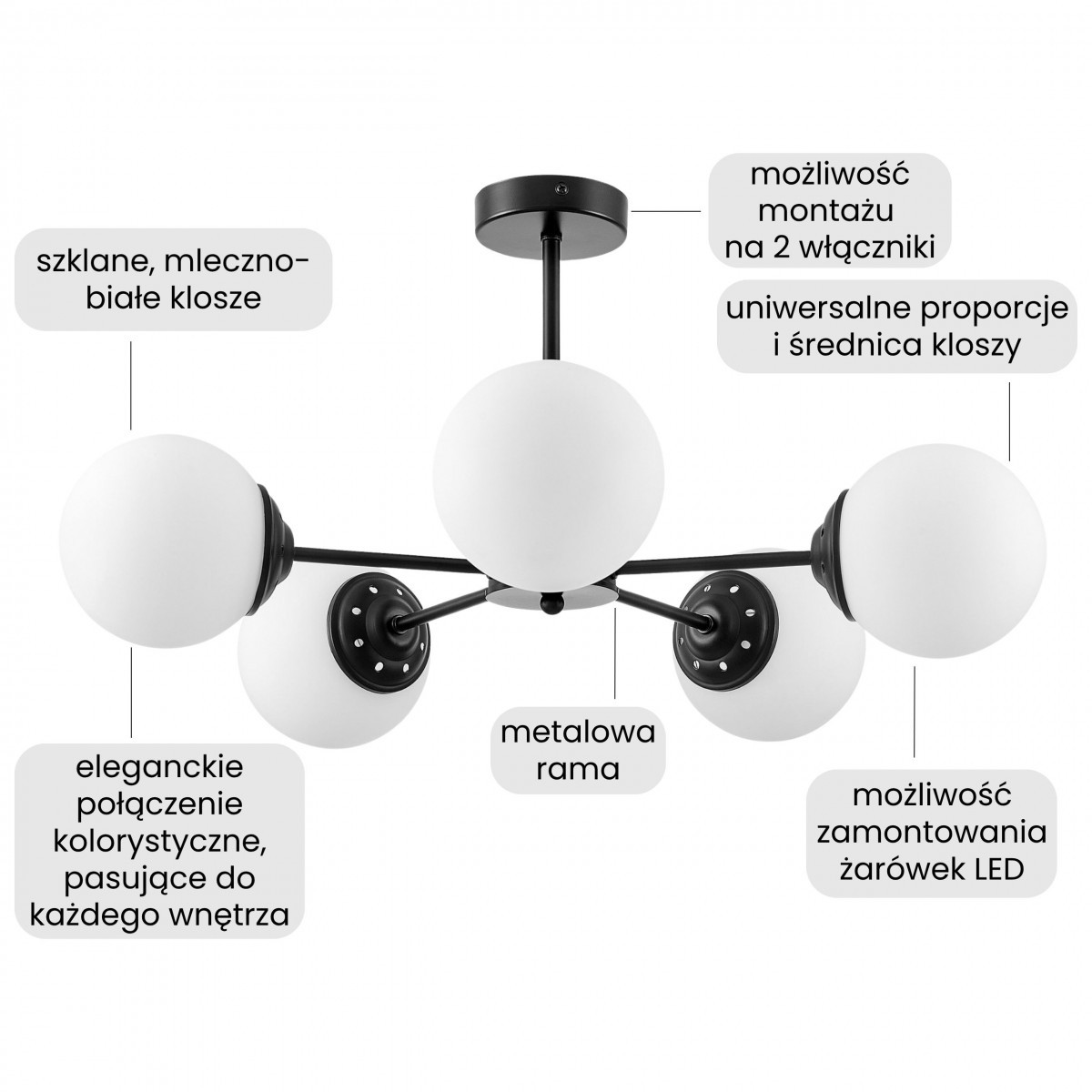Lampa wisząca w czarnej oprawie z pięcioma kulistymi kloszami to model, który natychmiast przyciąga uwagę dzięki formie opartej na pierścieniu. Smukła konstrukcja zaakcentowana bielą kul tworzy nowoczesny efekt, a klasyczna czerń dodaje surowej elegancji. To lampa, która łączy dekoracyjny charakter z codzienną funkcjonalnością.