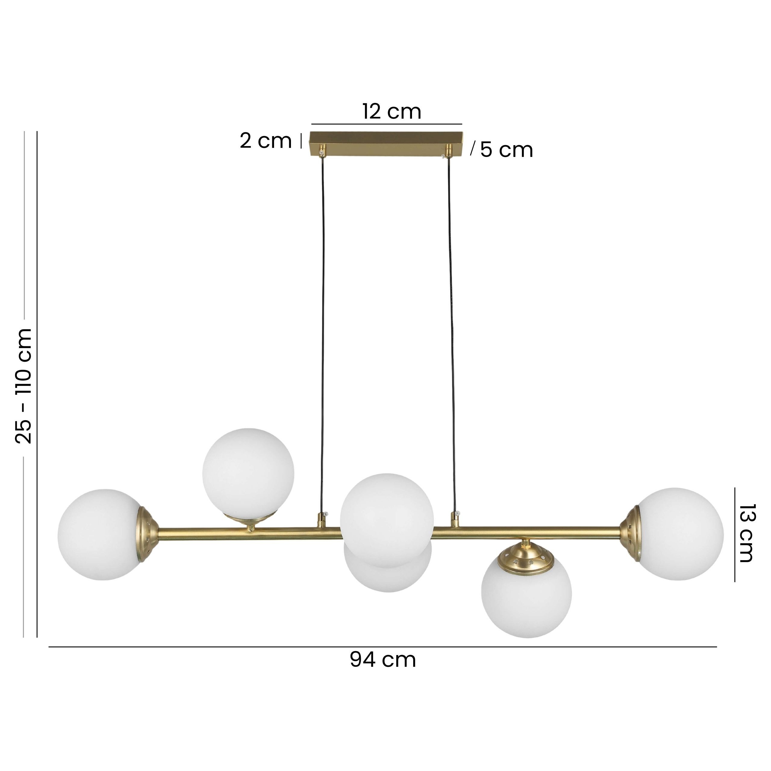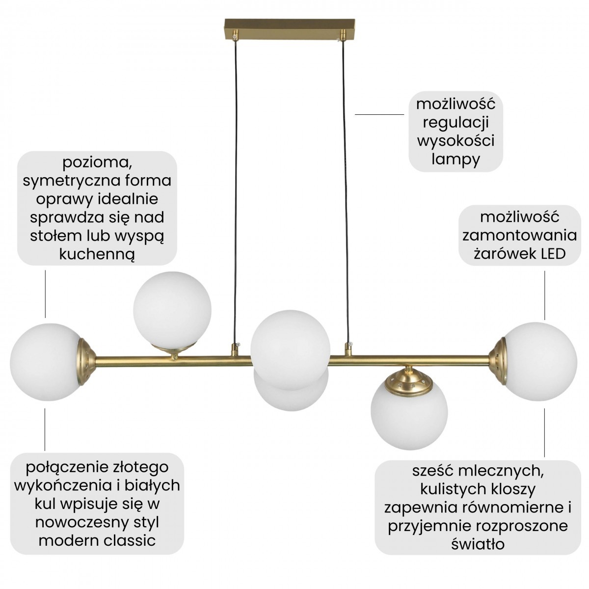 Lampa FINO w wersji ze szczotkowanym złotem daje elegancję, która podkreśla styl wnętrza. Sześć mlecznych kloszy ustawiono równomiernie, dzięki czemu lampa wisząca roztacza światło w sposób łagodny - nadal widoczny, ale bez efektu przesadnego kontrastu. Metalowa rama jest idealną ozdobą przedpokoju, centralnym punktem sypialni, a w domowym gabinecie wnosi dyskretny, nowoczesny charakter.