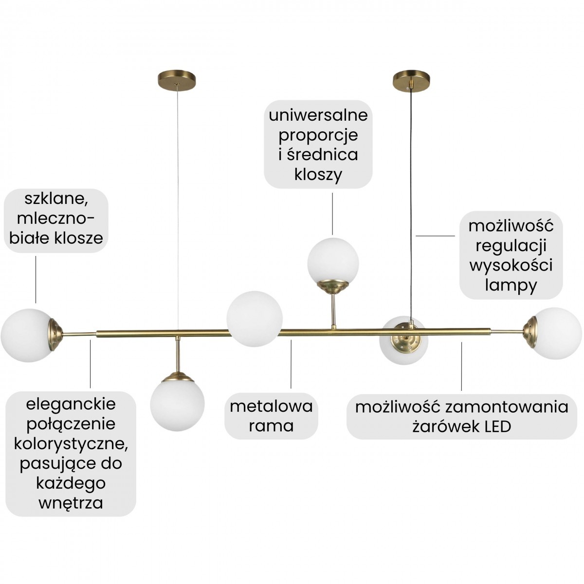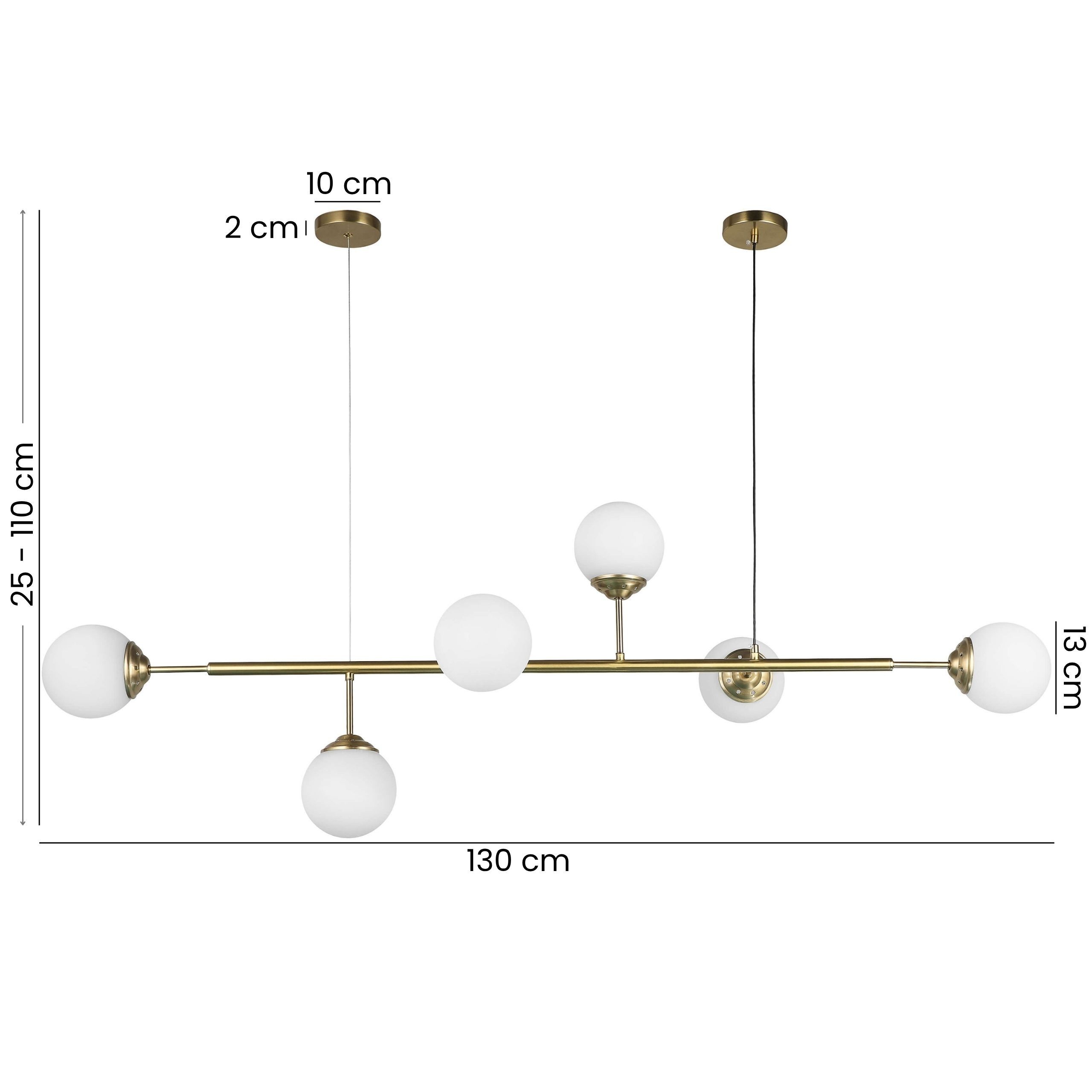 Lampa wisząca FINO W6 w wersji ze szczotkowanego złota łączy elegancję z prostą, geometryczną formą w nowoczesnym wydaniu. Sześć kulistych kloszy rozchodzi się symetrycznie od centralnej belki, tworząc harmonijny układ świetlny, który wpisuje się we współczesne wnętrza. Szczotkowane złoto podkreśla detale konstrukcji, dodając jej subtelniejszego wyrazu niż klasyczna wersja, ale z tą samą klasą i pięknym efektem wizualnym.
