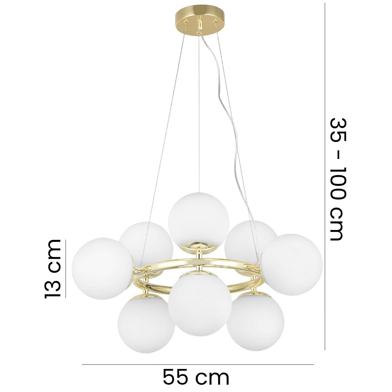 Model LEDO W9 to nowoczesna lampa wisząca w formie żyrandola, która potrafi stać się centralnym punktem aranżacji. Dziewięć mlecznych kul rozmieszczonych na złotej ramie daje światło, które obejmuje całą przestrzeń, eliminując potrzebę stosowania dodatkowych opraw.