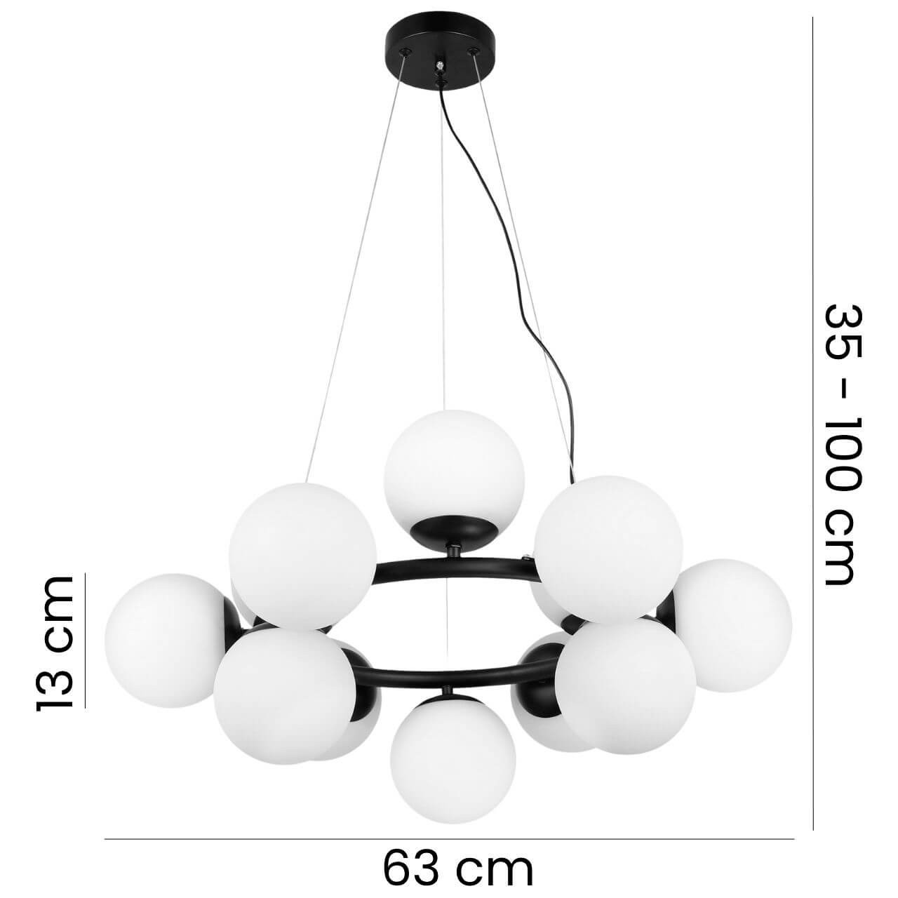 Czarna lampa wisząca LEDO W12 to propozycja dla osób, które szukają oświetlenia nowoczesnego i zarazem będącego wyrazistym akcentem we wnętrzach. Dwanaście białych kulistych kloszy rozmieszczono na smukłej, geometrycznej konstrukcji, dzięki czemu model świetnie sprawdza się nawet w przestronnych pomieszczeniach, gdzie jeden żyrandol może zastąpić kilka mniejszych lamp