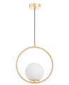 Złota lampa wisząca z linii VERO zachwyca elegancją i minimalistyczną konstrukcją. Biały klosz w kształcie kuli został zawieszony w delikatnej obręczy ze szczotkowanego złota, której powierzchnia ma elegancki, stonowany połysk. To połączenie proste, ale pełne luksusu w stonowanej formie – świetnie sprawdza się w nowoczesnych i klasycznych aranżacjach.