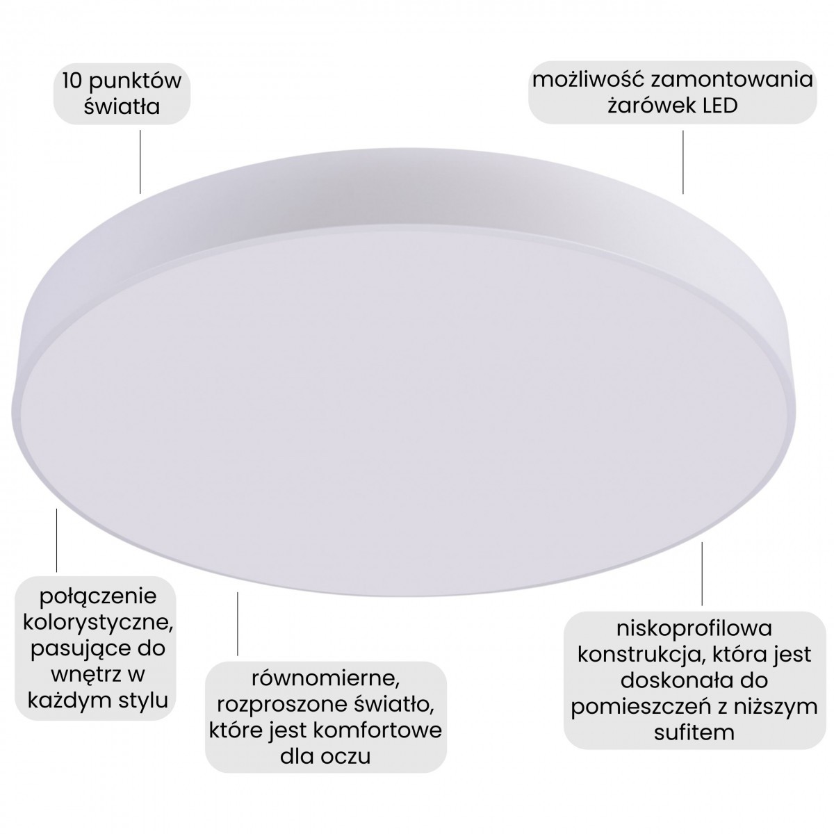 Nowoczesna lampa ORBO D78 dzięki uniwersalnemu wykończeniu i dużej powierzchni świetlnej sprawdza się we współczesnych przestrzeniach, gdzie ważne jest stabilne i równomierne światło. Okrągła forma sprzyja równomiernemu rozkładowi oświetlenia w całym pomieszczeniu, co zwiększa wygodę codziennego użytkowania. Plafon dobrze sprawdza się jako główne źródło światła w przestrzeniach dziennych i użytkowych jako: lampa do sypialni, salonu, przedpokoju, kuchni i otwartych stref.