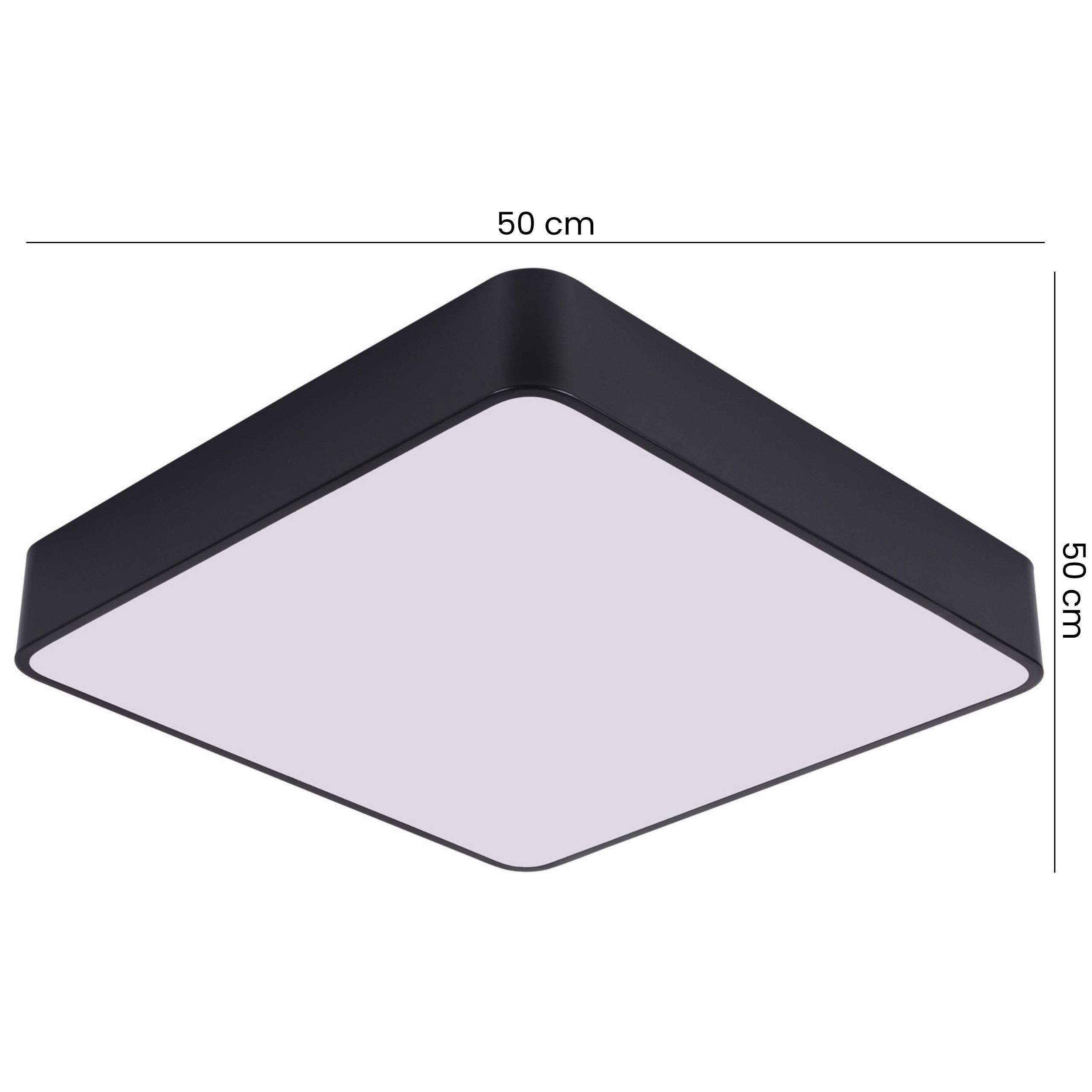 CUBO D50 to czarna lampa sufitowa w kształcie kwadratu, o wymiarach 50 x 50 cm, posiadająca minimalistyczną formę i mleczny panel świetlny, które tworzą nowoczesne rozwiązanie do współczesnych wnętrz. To model zaprojektowany do przestrzeni, w których światło ma zapewniać komfort zarówno w ciągu dnia, jak i wieczorem.