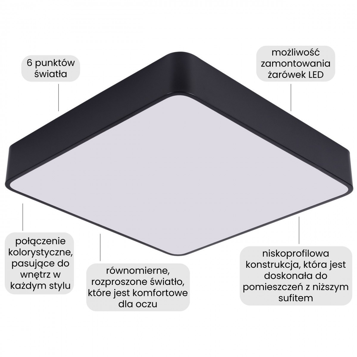 Nowoczesna lampa sufitowa w kwadracie doskonale sprawdza się w pomieszczeniach przeznaczonych do relaksu i wyciszenia, ale również w przestrzeniach dziennych. Zapewnia światło, które sprzyja odpoczynkowi po intensywnym dniu, wieczornemu czytaniu czy spokojnym rozmowom wśród najbliższych, a także sprzyja różnym czynnościom w ciągu dnia. Model z powodzeniem może pełnić rolę głównego oświetlenia jako lampa do salonu lub sypialni, zapewniając przyjemne warunki i stylowy design.