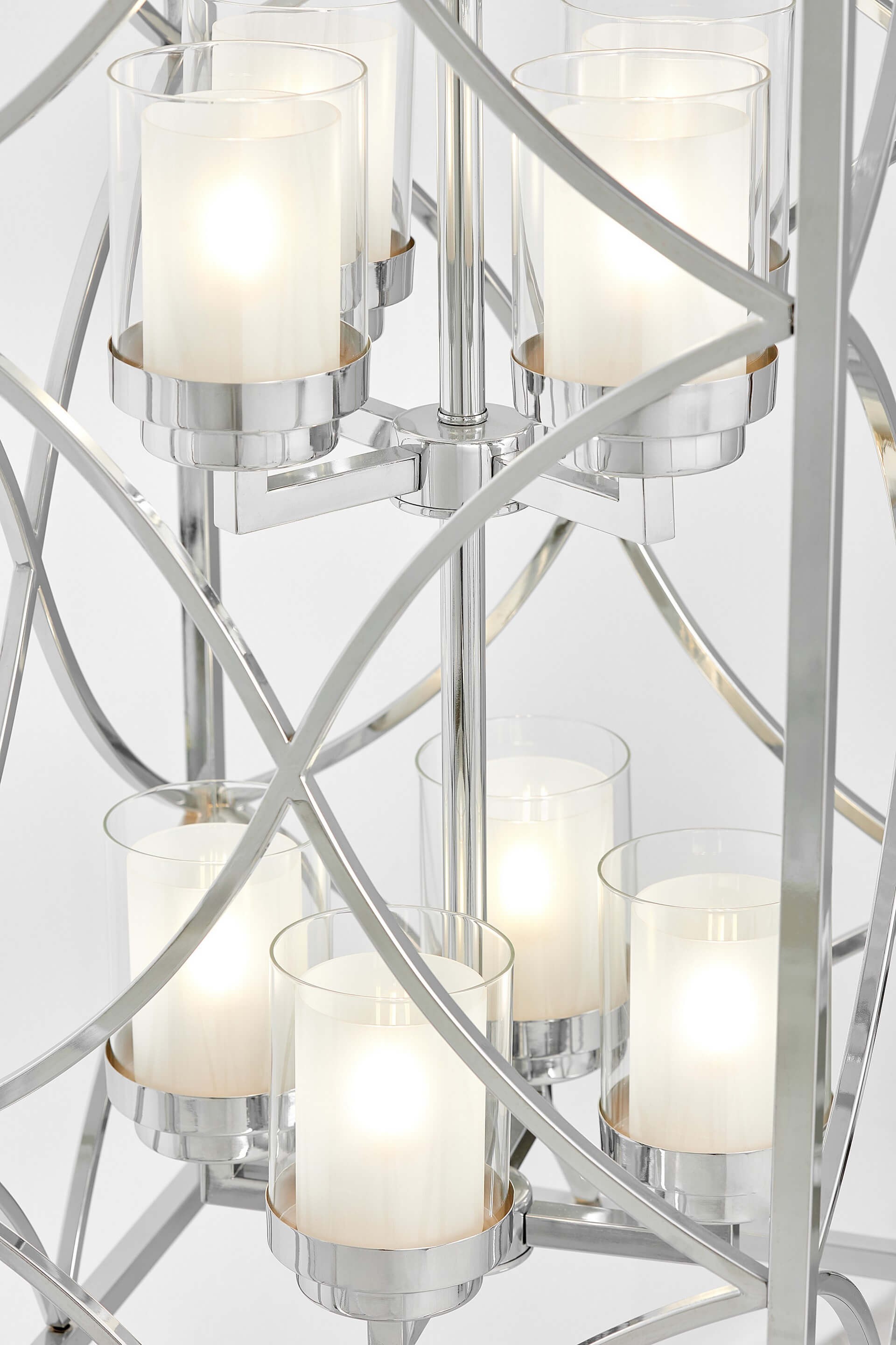 Wśród kolekcji QUADRATO DUO znaleźć można oświetlenie będące zarówno praktycznym, jak i efektownie zdobiącym wnętrze. Chromowana oprawa lampy wraz ze swoją niecodzienną architektoniką oraz sporymi rozmiarami pomaga stworzyć w pomieszczeniu ciekawą aranżację, podkreślającą loftowy klimat wnętrza. Wewnątrz geometrycznej, metalowej bryły, projektanci umieścili osiem kloszy na dwóch kondygnacjach, dzięki czemu światło rozchodzi się po pomieszczeniu równomiernie, docierając do jego najdalszych zakamarków.
