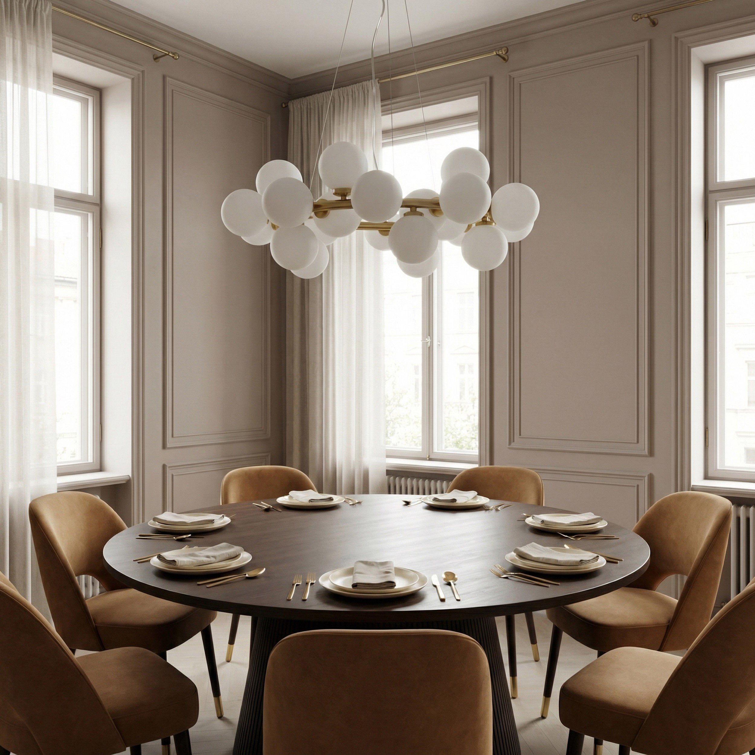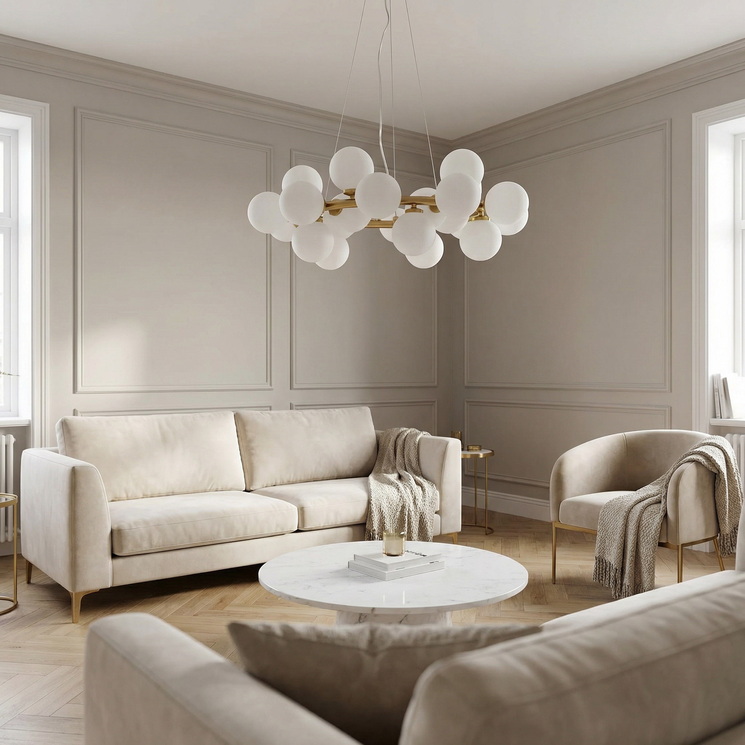 Okazałość lampy wiszącej MARSIADA przejawia się zarówno w jej wielkości oraz zadziwiającej ilości dwudziestu pięciu kloszy. Wykonana z białego szkła obudowa źródeł światła nieskazitelnie dopasowuje się do metalowej, mosiężnej oprawy. Kształt i monumentalność lampy są przejawem nowoczesnych trendów, które idealnie wkomponują się w przestrzeń reprezentacyjnego salonu, wejścia do domu oraz jadalni.