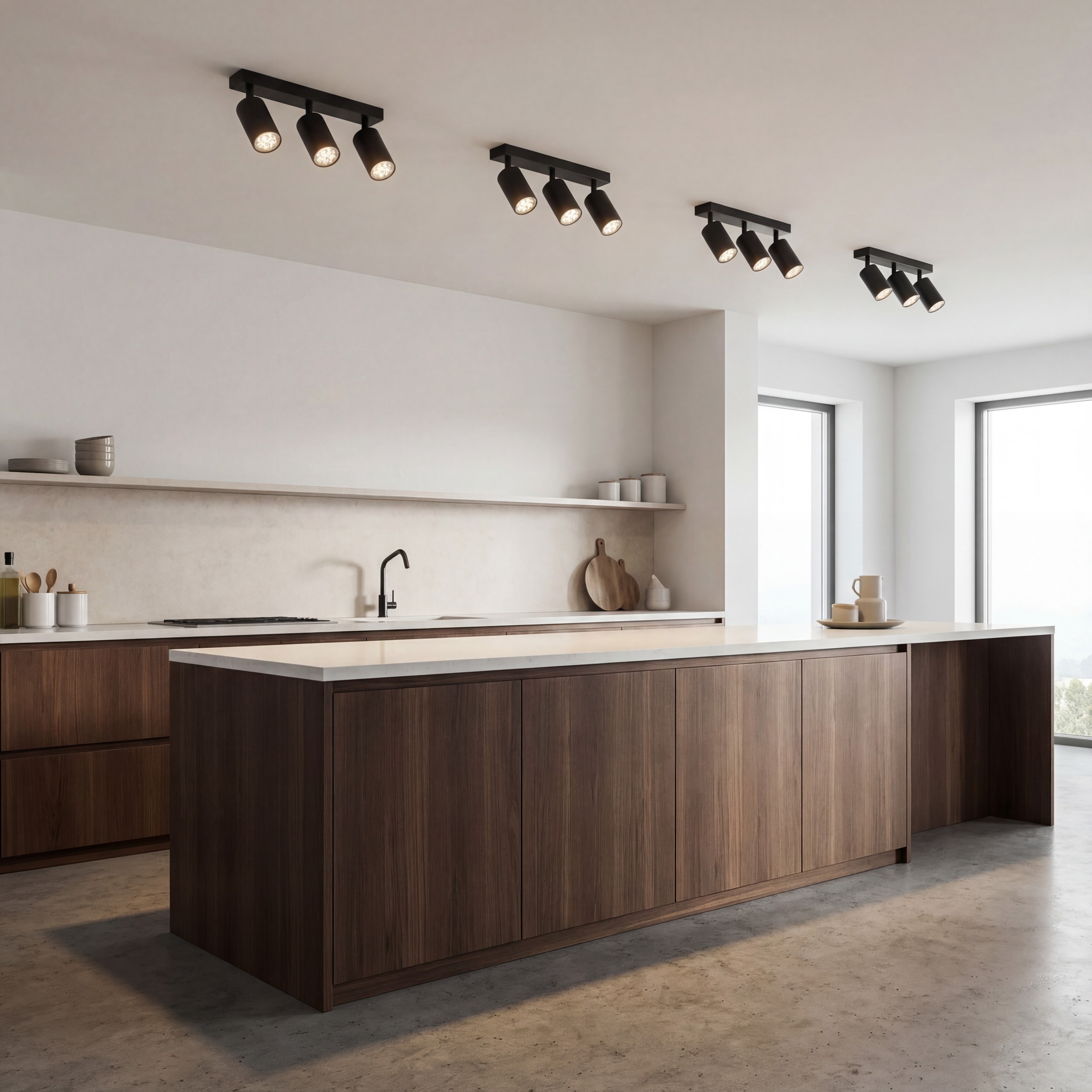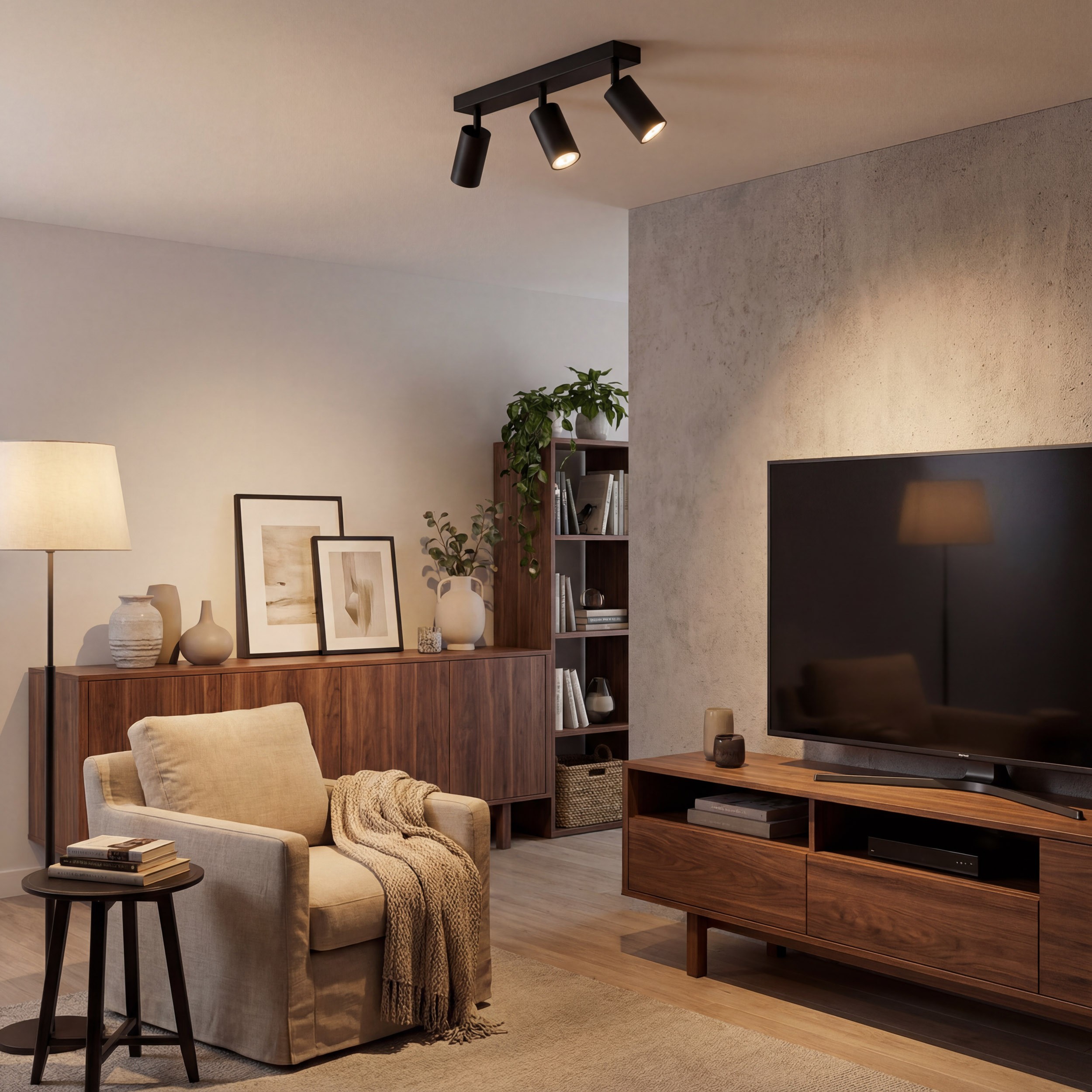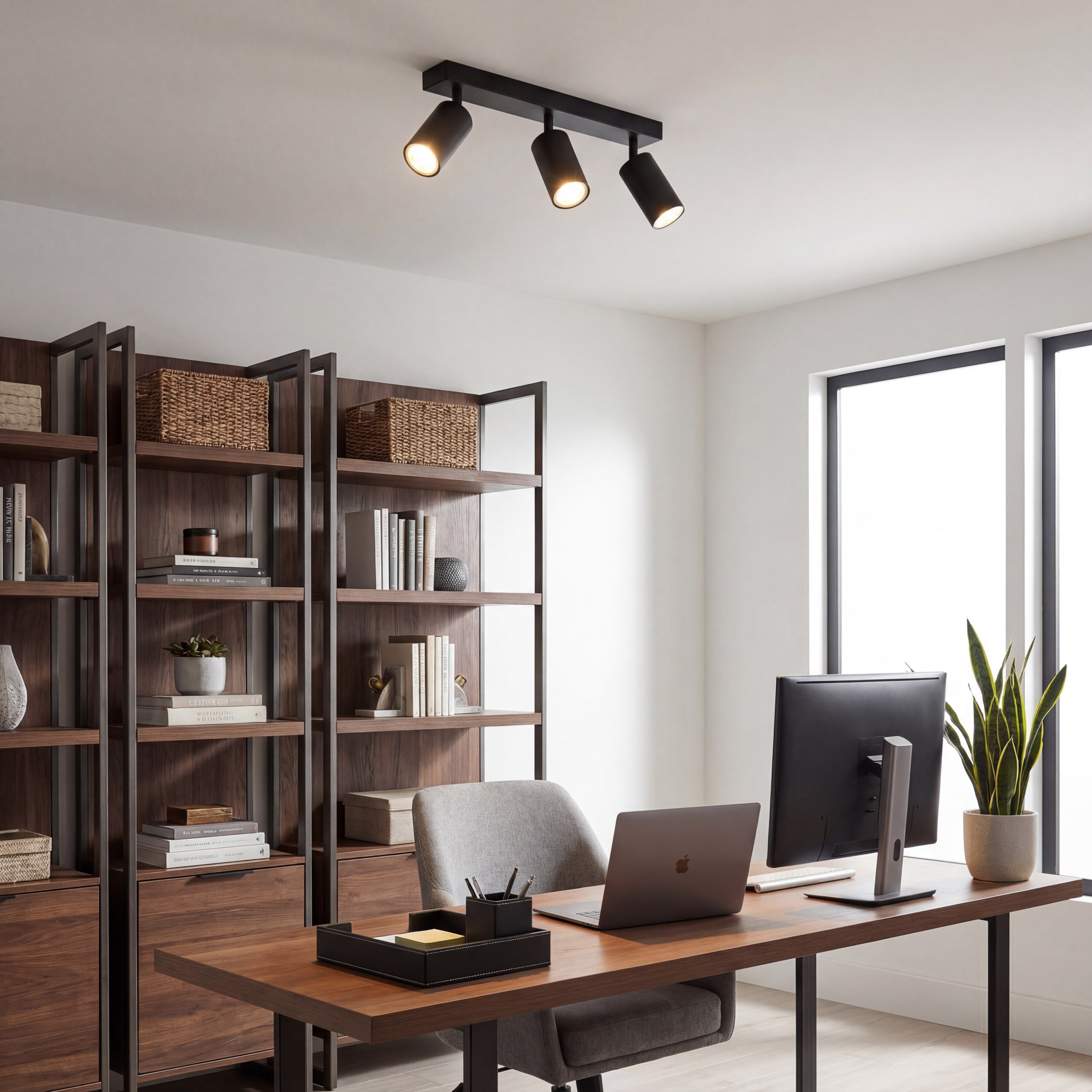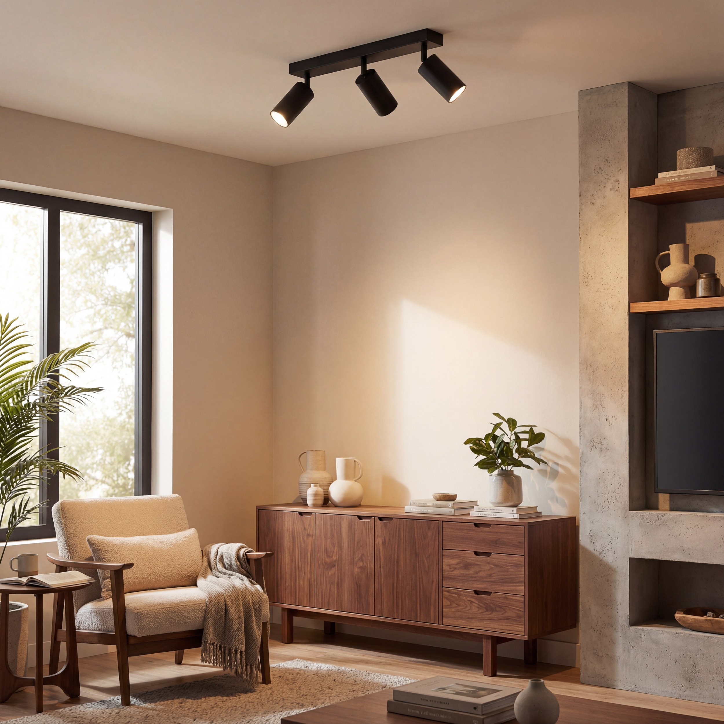 Czarna potrójna lampa sufitowa posiada prosty, współczesny design, który łatwo łączyć z różnymi wykończeniami wnętrz. Tuby pozwalają ustawiać światło tak, aby delikatnie podkreślić fakturę ścian, stworzyć przyjazną atmosferę w formie lampy do kuchni i jadalni lub wyczarować nastrojową strefę relaksu. To model dla osób, które lubią, gdy światło domowe ma swoją rolę – praktyczną i estetyczną.