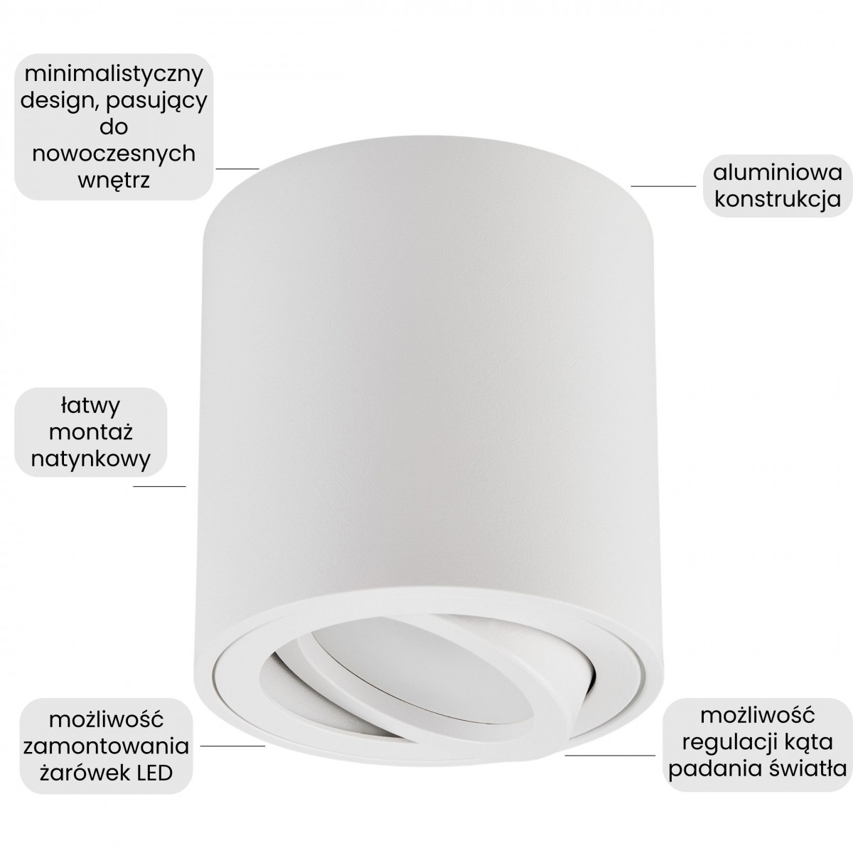 BOLT W1 w białym kolorze to kompaktowa, cylindryczna oprawa natynkowa z jednym źródłem światła. Jej neutralny wygląd sprawia, że idealnie pasuje do wnętrz, w których dominuje minimalizm i jasna kolorystyka.