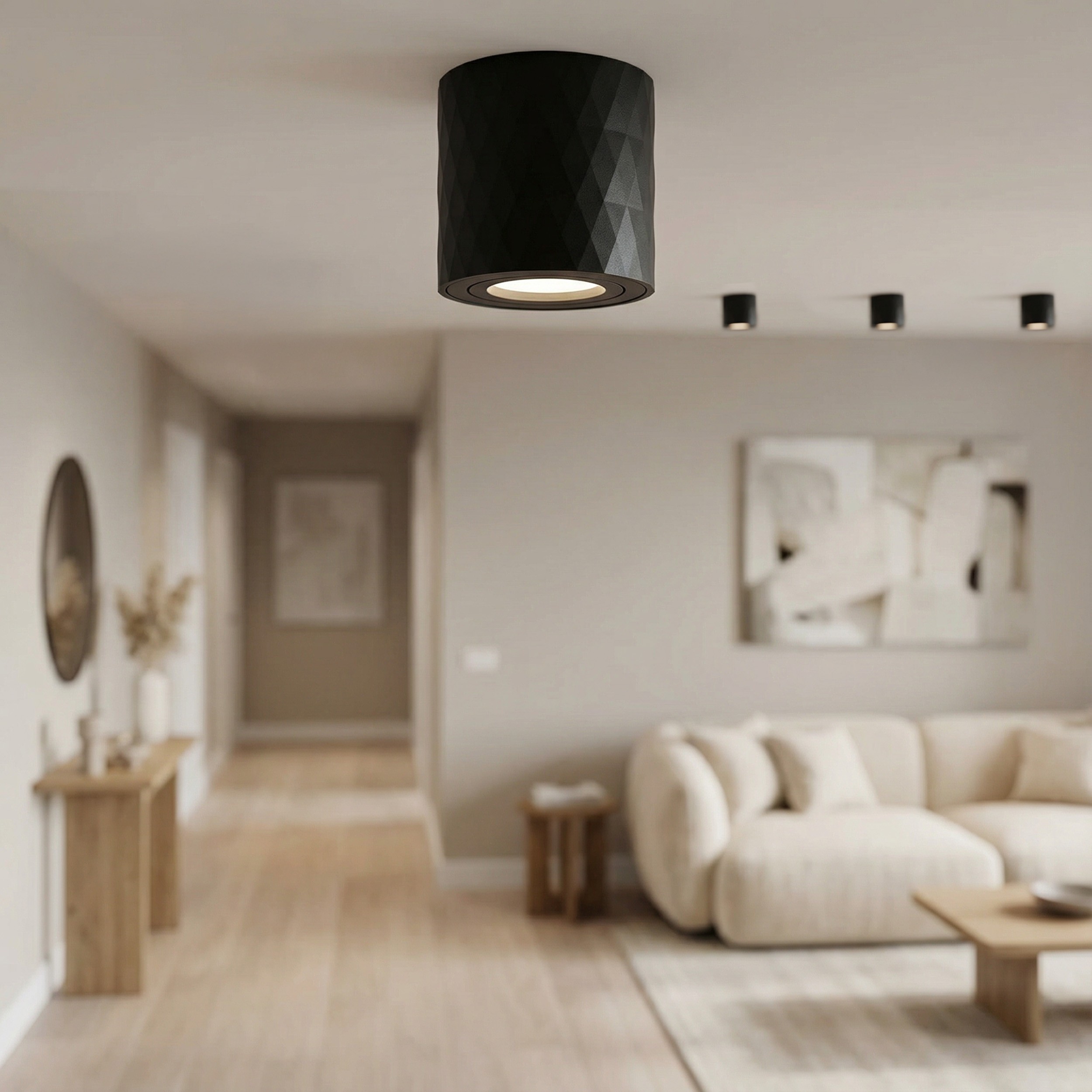 TIGO W1 to czarna, natynkowa oprawa sufitowa o cylindrycznym kształcie i geometrycznej, diamentowej strukturze na powierzchni. Spot wygląda elegancko i nowocześnie, a jednocześnie wzbogaca wystrój pomieszczenia w minimalistyczny sposób.