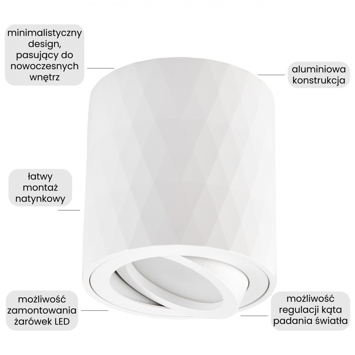 TIGO W1 to nowoczesny spot z geometrycznym wykończeniu przypominającym fakturę diamentu. Biały kolor sprawia, że oprawa harmonizuje zarówno z jasnymi, jak i kontrastowymi aranżacjami. Doskonale sprawdza się w różnych pomieszczeniach, tworząc atmosferę sprzyjającą domowym czynnościom i relaksowi. W sypialni pozwala stworzyć spokojny, nastrojowy klimat, a w salonie lub w roli spotu do kuchni pełni rolę precyzyjnego oświetlenia funkcjonalnego.