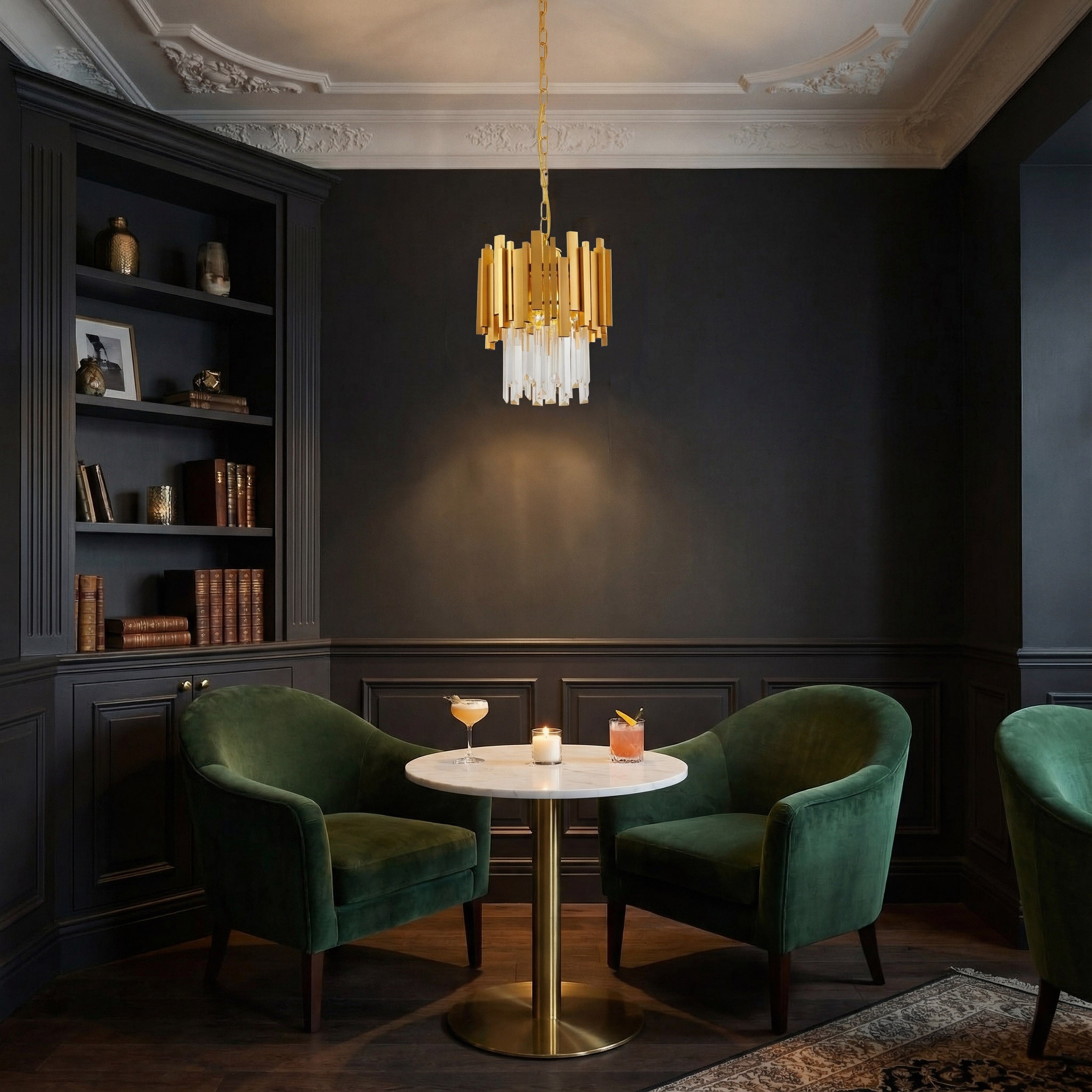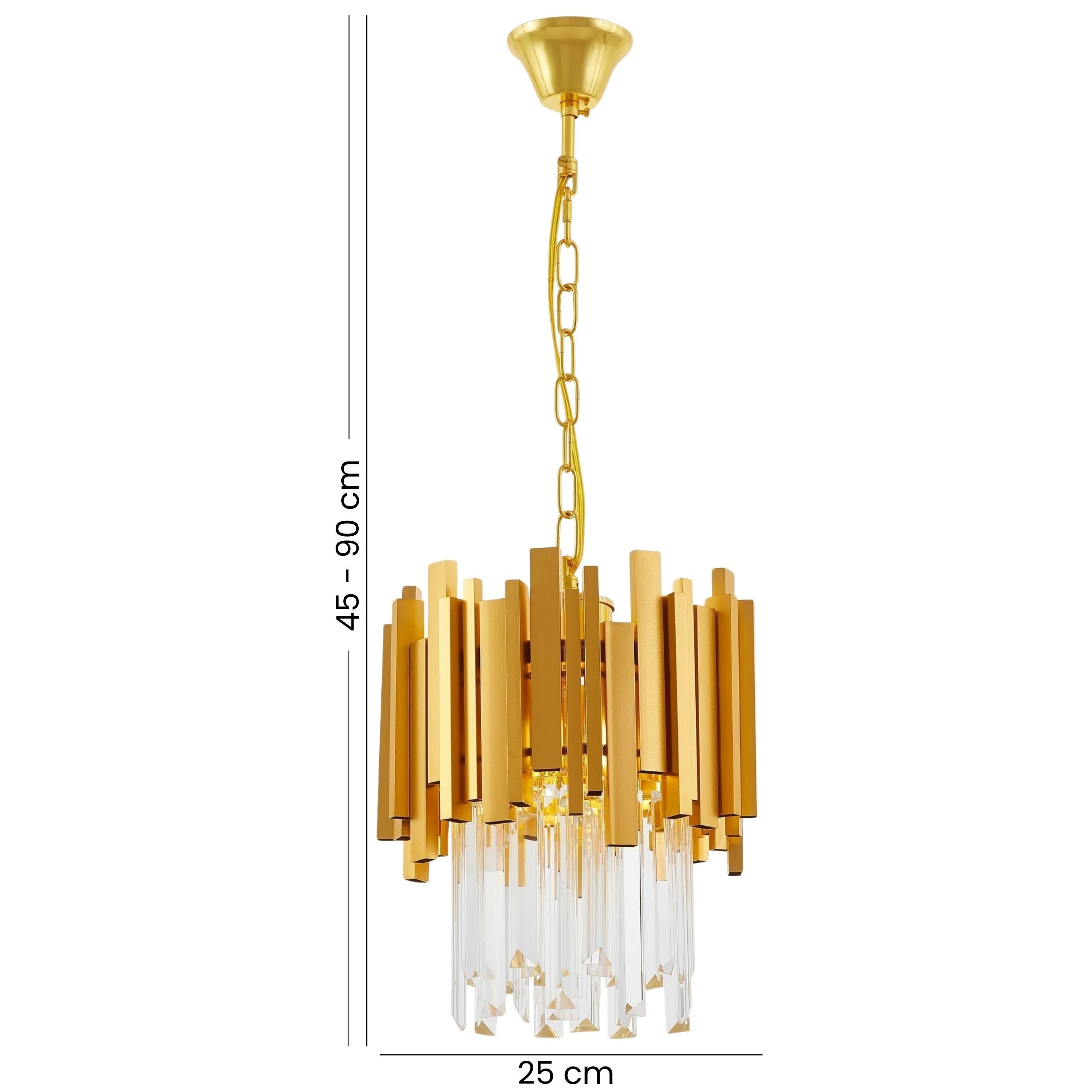 FERA D25 to bardzo elegancka, klasyczna lampa wisząca w formie żyrandola, stworzona z myślą o wytwornych, stylowych wnętrzach. Ozdobna konstrukcja lampy łączy geometryczne, metalowe elementy z długimi, transparentnymi kryształkami, które efektownie rozświetlają pomieszczenie. FERA świetnie sprawdzi się jako główne oświetlenie w roli żyrandola do salonu lub elegancki akcent nad stołem, niezależnie od tego, czy wnętrze jest nowoczesne, klasyczne czy w stylu glamour.