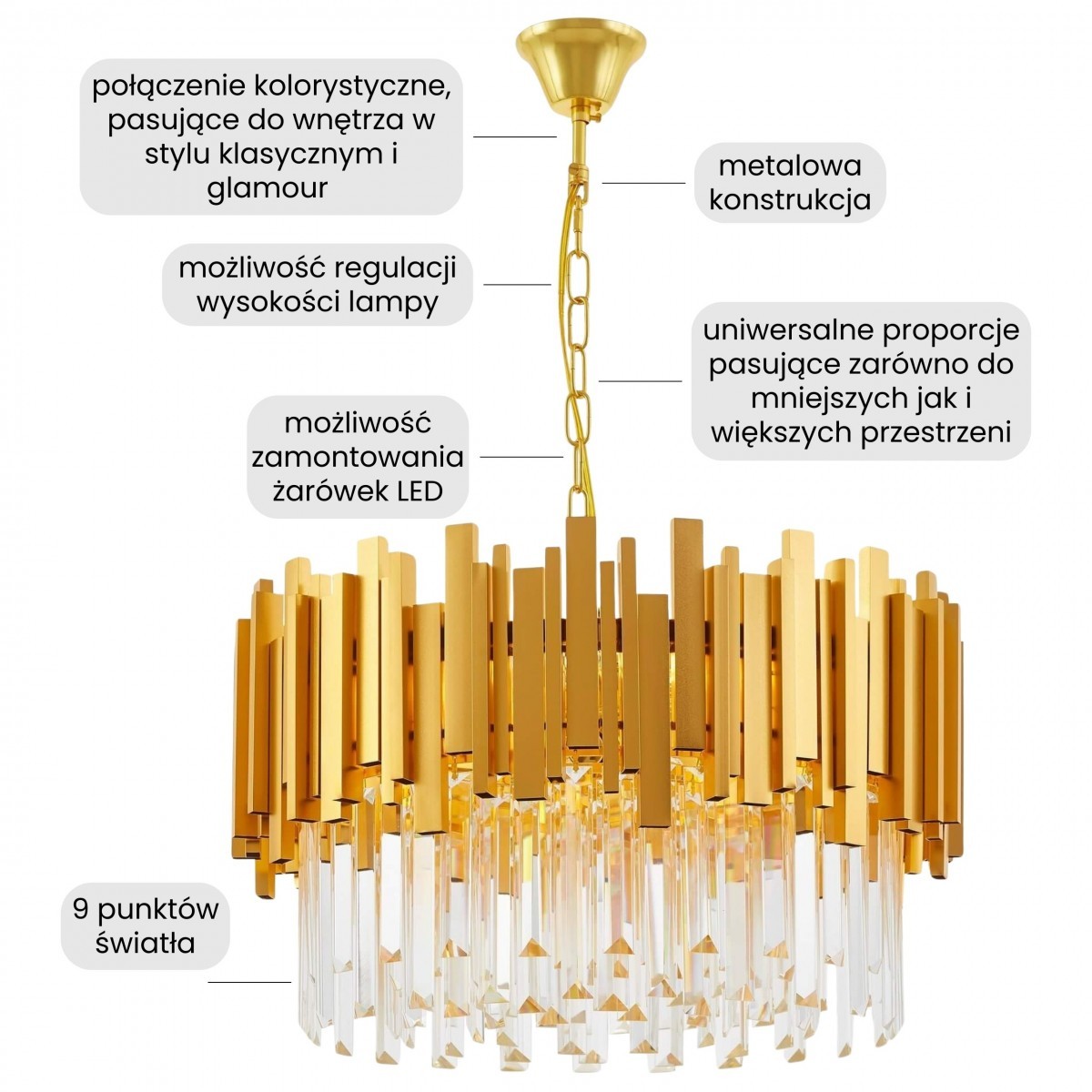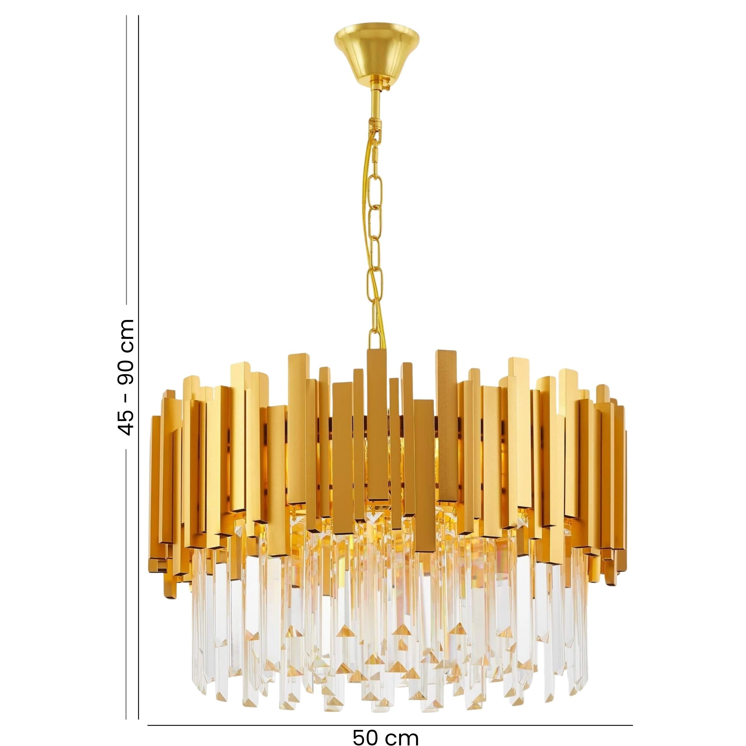 FERA D50 to złote panele o różnej wysokości, które tworzą warstwową, dynamiczną kompozycję, nadając modelowi nowoczesnego charakteru. Kryształy umieszczone poniżej oprawy dodają całości lekkości i szlachetności, a ich transparentne wykończenie subtelnie rozprasza światło z dziewięciu żarówek. Ten złoty żyrandol tworzy elegancki klimat, który doskonale współgra z luksusowym wystrojem wnętrza.