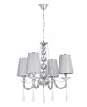 Chromowany żyrandol kryształowy o sześciu punktach światła w postaci kremowych, pokrytych falistym suknem abażurach. Łukowate ramiona wykonane ze srebrnego metalu połączone delikatnymi łańcuszkami z dekoracyjnym regulowanym kablem. Cała konstrukcja udelikatniona przezroczystymi kryształkami, efektownie odbijającymi padające z kloszy światło.