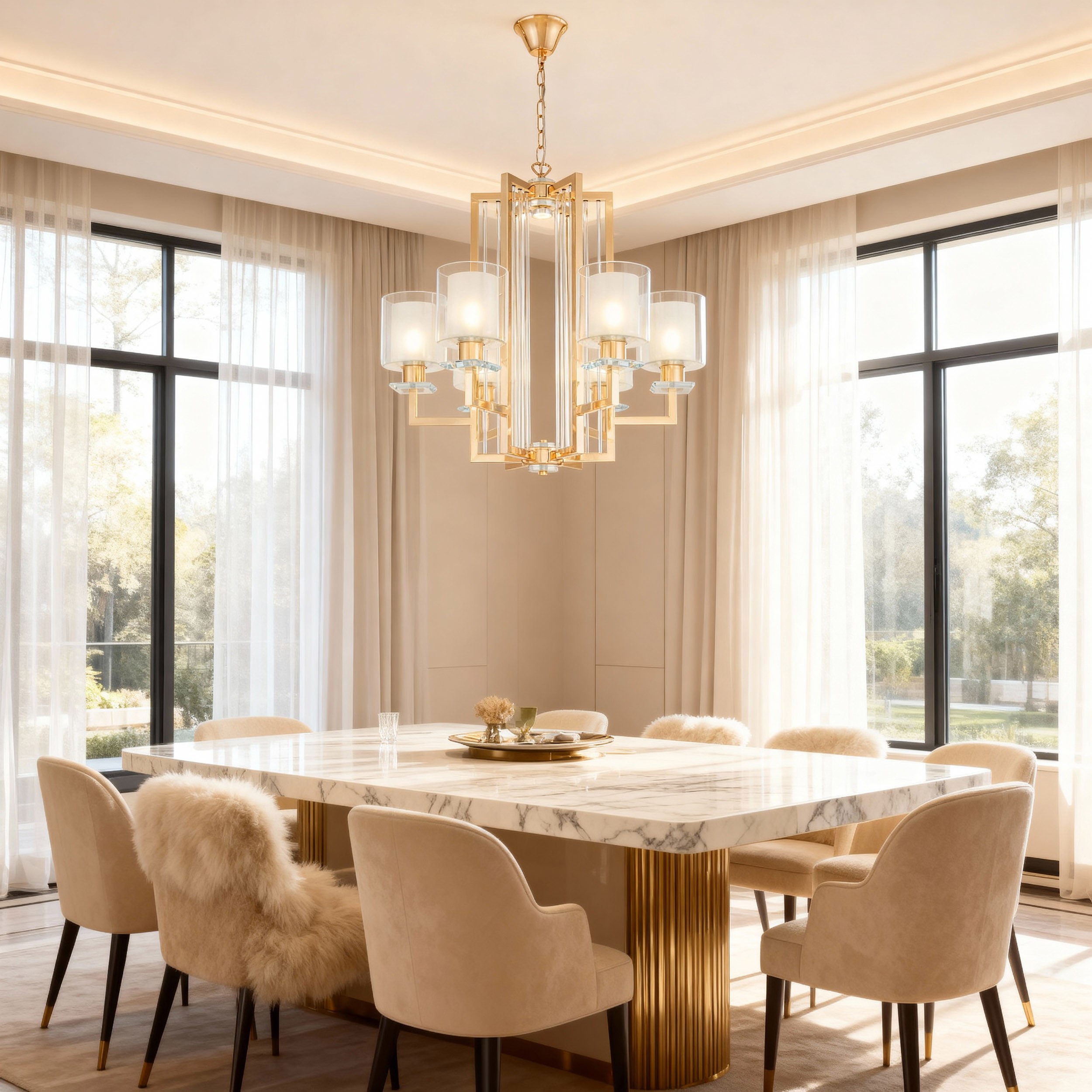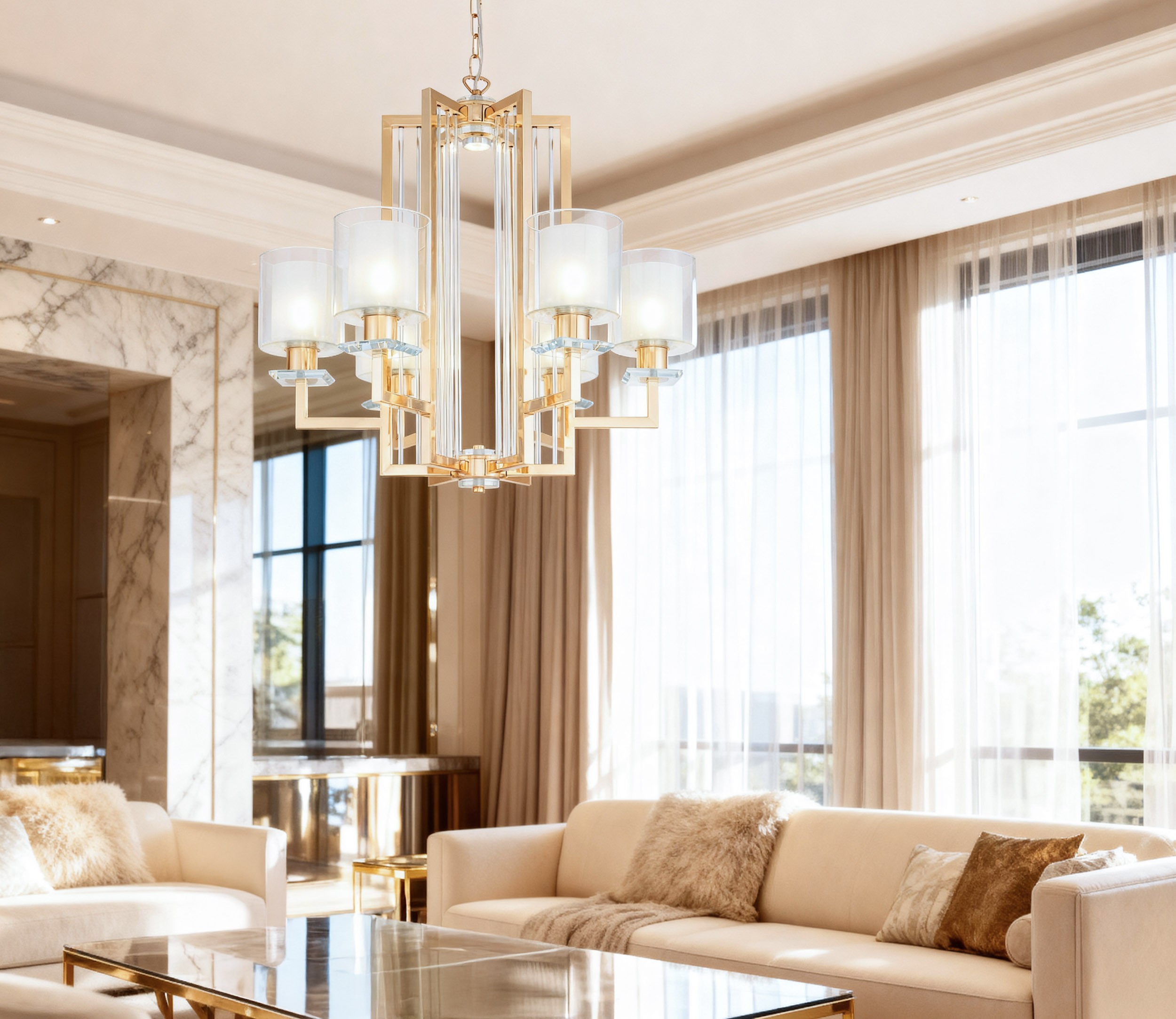 O serii MANHATTAN można powiedzieć wiele, jednak to, za co należą jej się słowa największego uznania to minimalizm i pomysłowa aranżacja w jednym. Jej metalowy szkielet w ciepłym, złotym odcieniu składa się z prostokątnych metalowych i szklanych ram połączonych ze sobą i tworzy ciekawe tło dla sześciu źródeł światła. Są nimi wykonane z białego, mlecznego szkła tuby, przesłonięte szklanymi osłonkami, tworzącymi podwójne ścianki kloszy. Całość podtrzymywana jest regulowanym kablem zamkniętym w złotej osłonce.