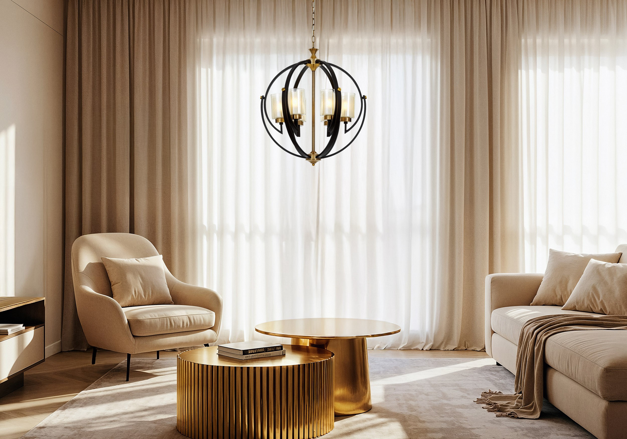 Kompozycja czarno-mosiężnej oprawy lampy wiszącej BERGEN W6 kreuje jej finezyjny wygląd, w którym mocno dostrzegalne jest wymieszanie stylu industrialnego, nowoczesnego oraz cechującego się surowością nurtu glamour. Osadzenie na metalowej konstrukcji sześciu źródeł światła wpływa na funkcjonalizm powiązany ze wspomnianymi stylami i pozwala na rozświetlenie salonów i klatek schodowych.