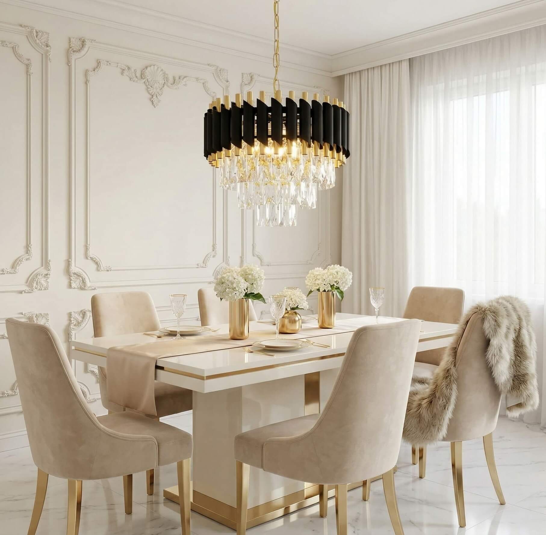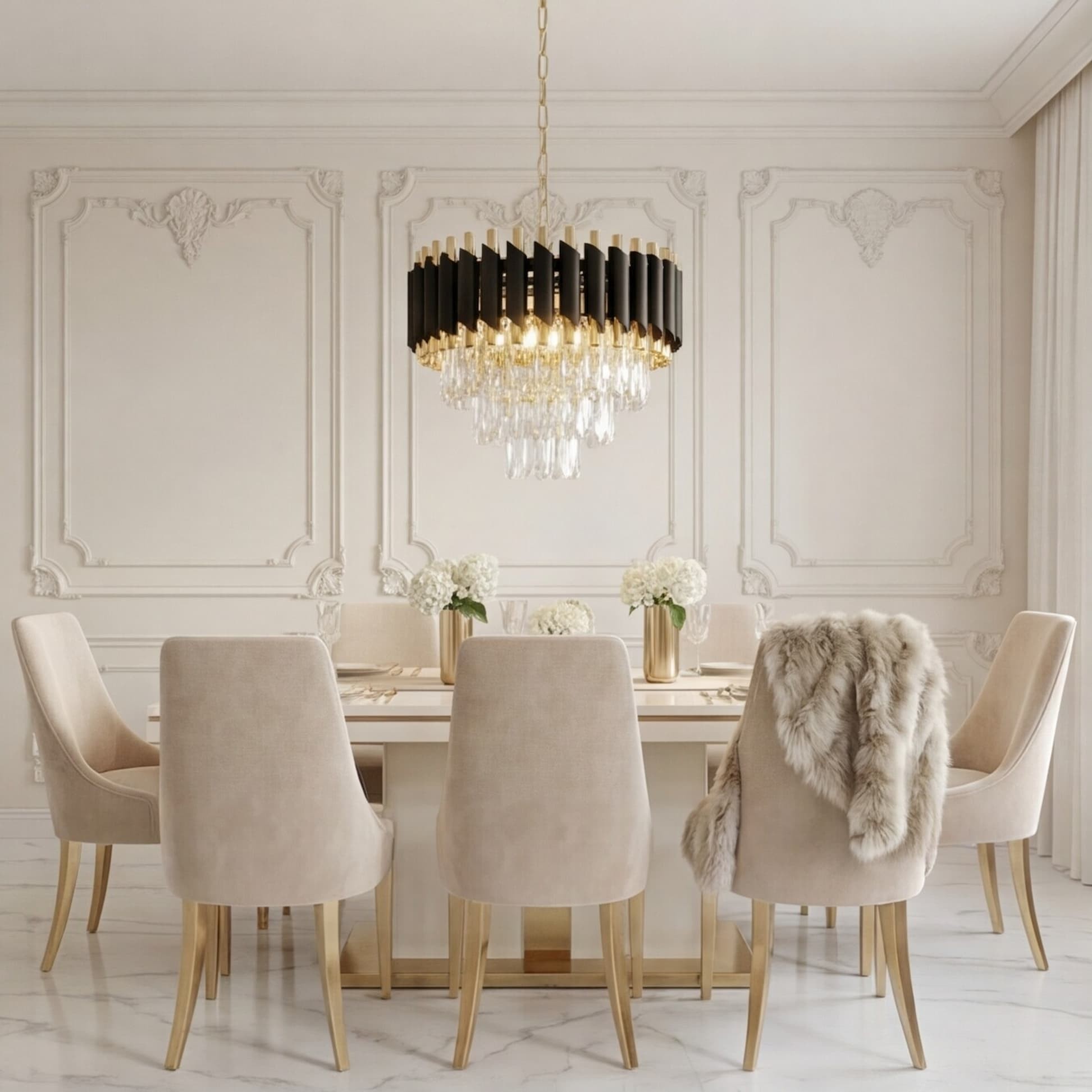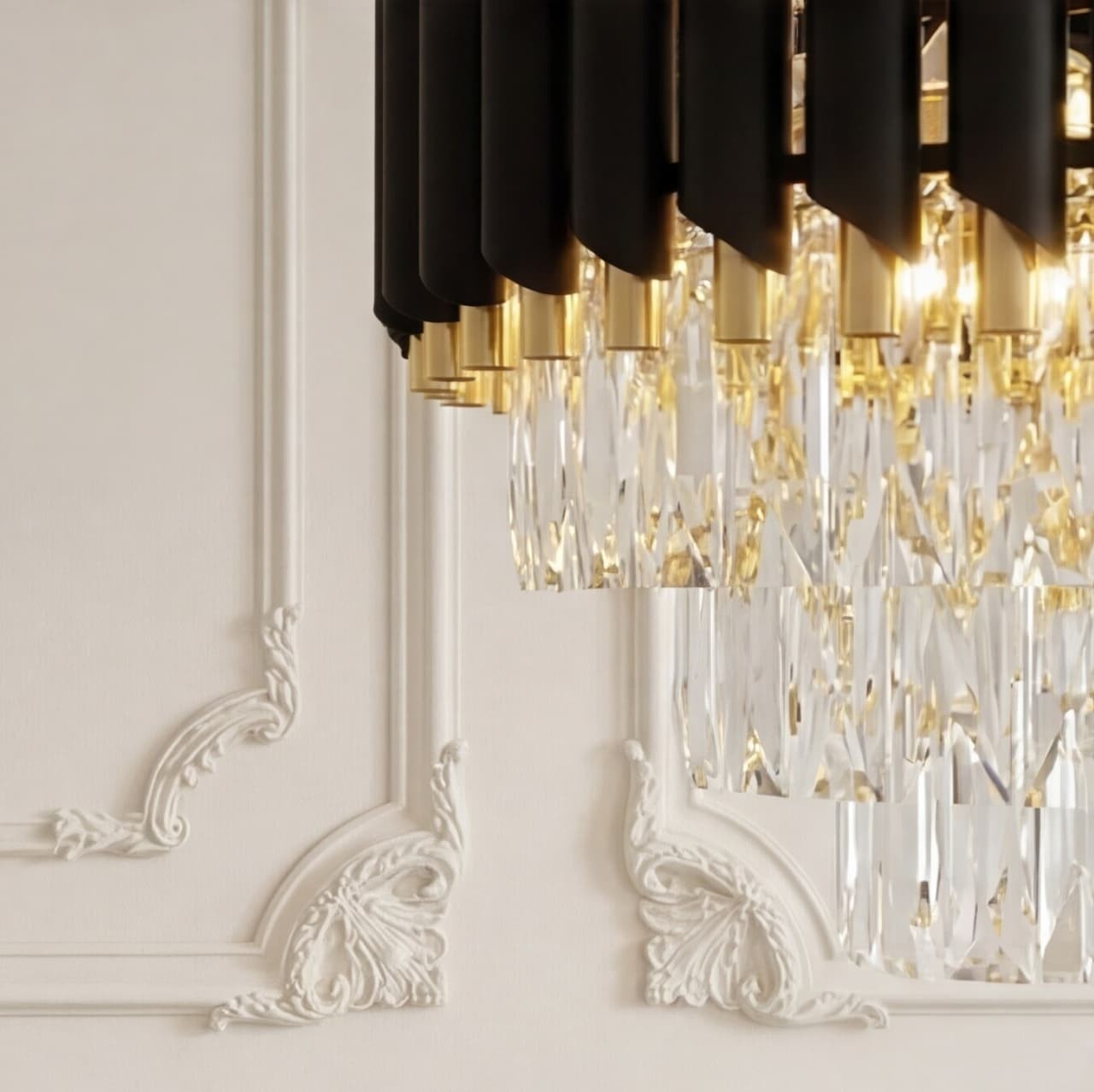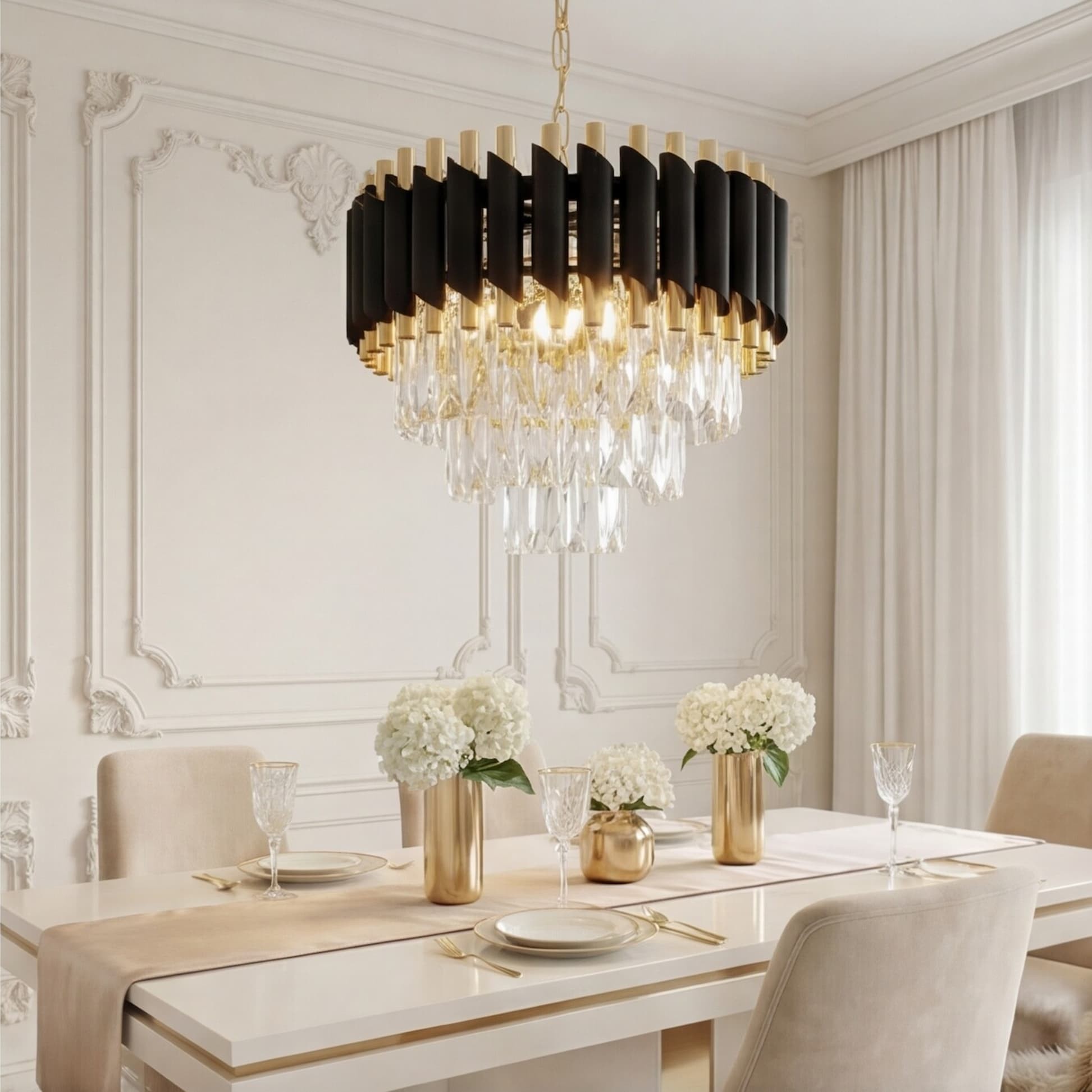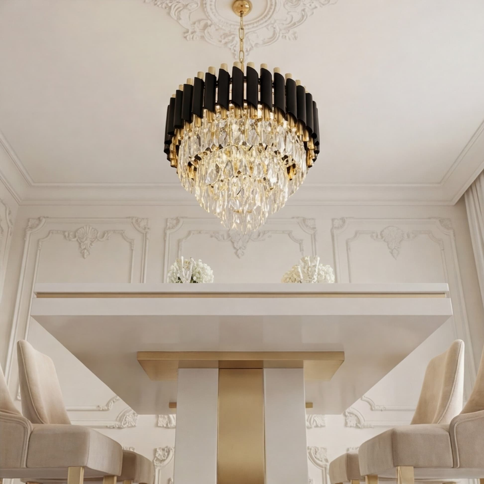 Żyrandol Mazini D40 łączy w sobie bogactwo formy i materiałów, przepych i niesłychaną ekstrawagancję podkreśloną czarno-złotą oprawą oraz sześcioma punktami światła. Mocno wyczuwalny klasyczny styl przeplata w swojej kompozycji elementy charakterystyczne dla innowacyjnych form. Wytworne dekoracje w formie kryształowego dołu żyrandola idealnie wkomponują się w wystrój salonu czy sali bankietowej.